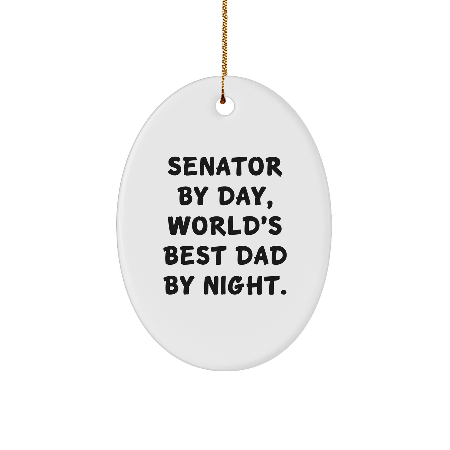- The ideal gift for the Senator in your life, this Oval Ornament features the quote 'Senator By Day, World's Best Dad By Night' printed on it, making it a thoughtful and personalized gift.