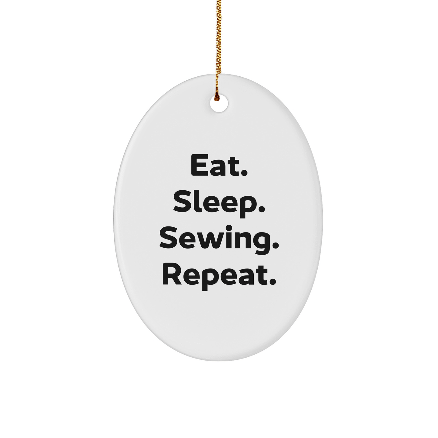 Whether you're looking for a gift for a sewing enthusiast or want to treat yourself, this oval ornament is a thoughtful and unique gift. So why wait? Get your 'Eat. Sleep. Sewing. Repeat.' oval ornament today and spread the joy of sewing to those around you!
