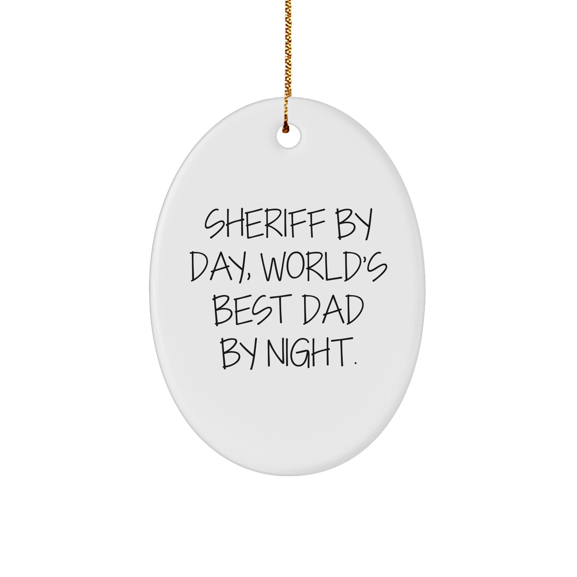 Are you looking for a unique and funny gift for the Sheriff in your life? Look no further! This 'Sheriff By Day, World's Best Dad By Night.' Oval Ornament is a thoughtful and humorous way to show your appreciation for their dedication to keeping your community safe. With its vibrant colors and high-gloss finish, this ornament is sure to stand out on your Christmas tree or as a decoration in your home.