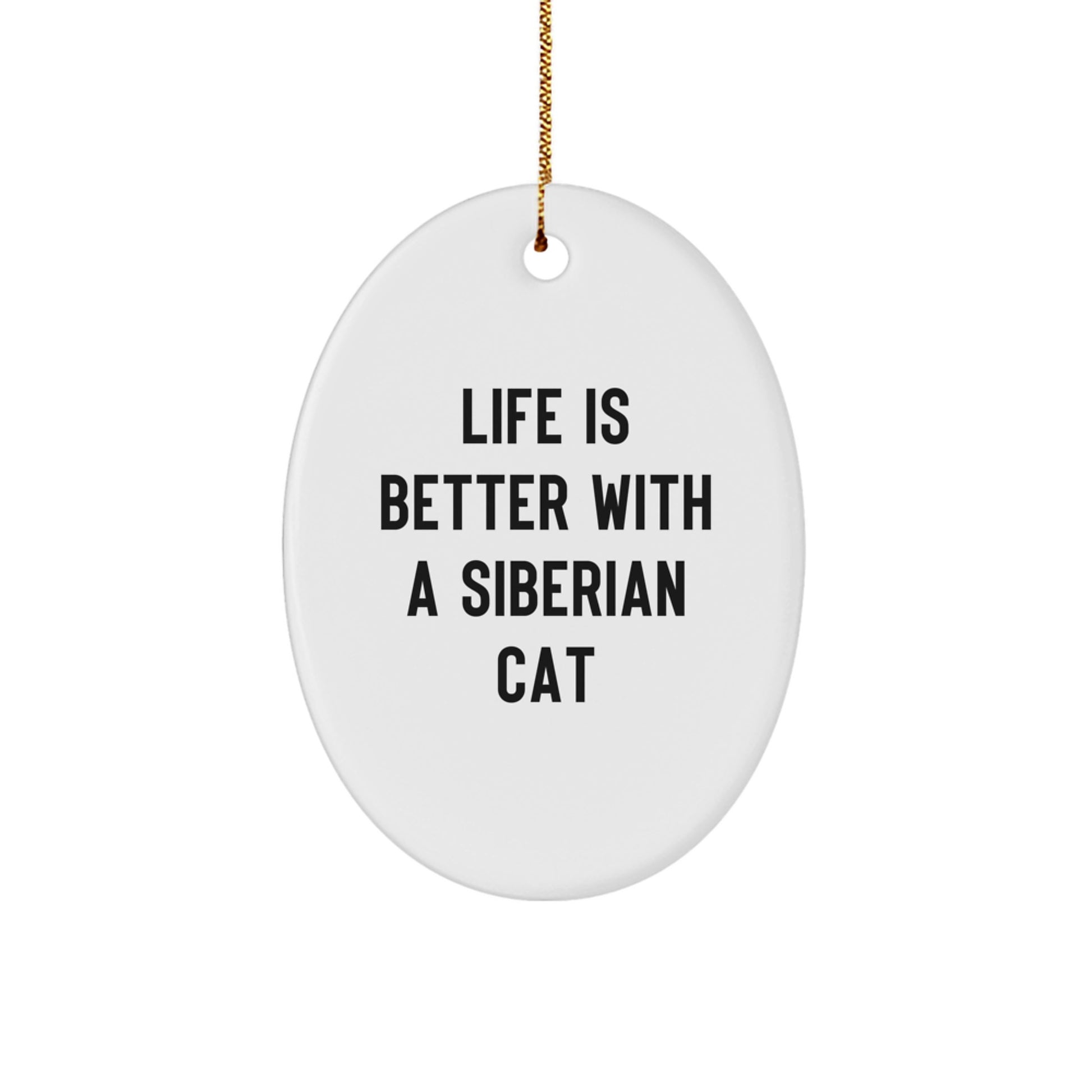 Are you looking for a unique gift for the Siberian Cat enthusiast in your life? Look no further! This oval ornament is a thoughtful gift that celebrates the joy and companionship of these beautiful cats. The quote 'Life Is Better With A Siberian Cat' is a heartwarming reminder of the special bond between humans and animals.