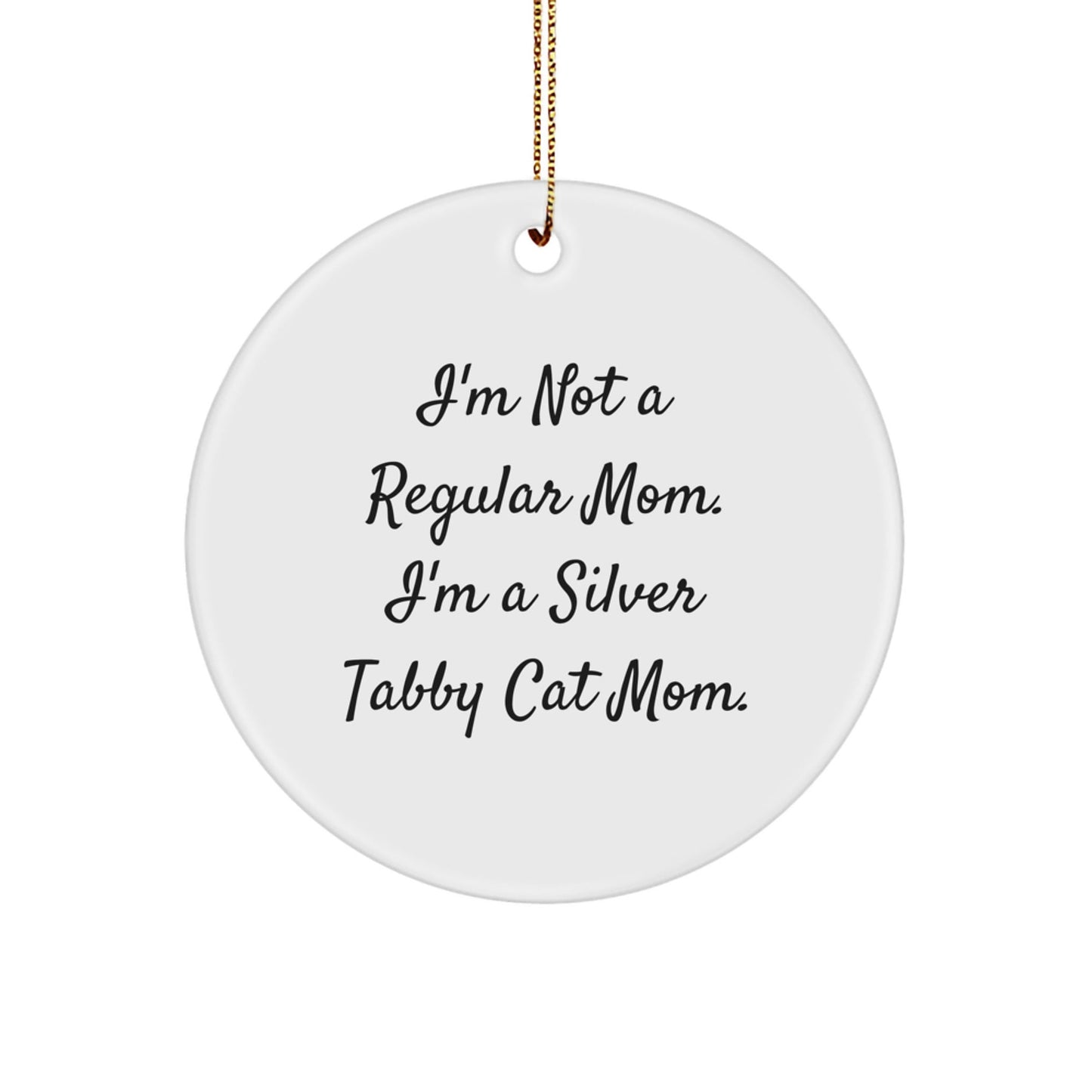 If you're a proud Silver Tabby Cat mom, you'll love this funny and inspirational gift for yourself or a fellow cat enthusiast. This Christmas, spread some joy and laughter with our circle ornament featuring the quote 'I'm Not A Regular Mom. I'm A Silver Tabby Cat Mom.'