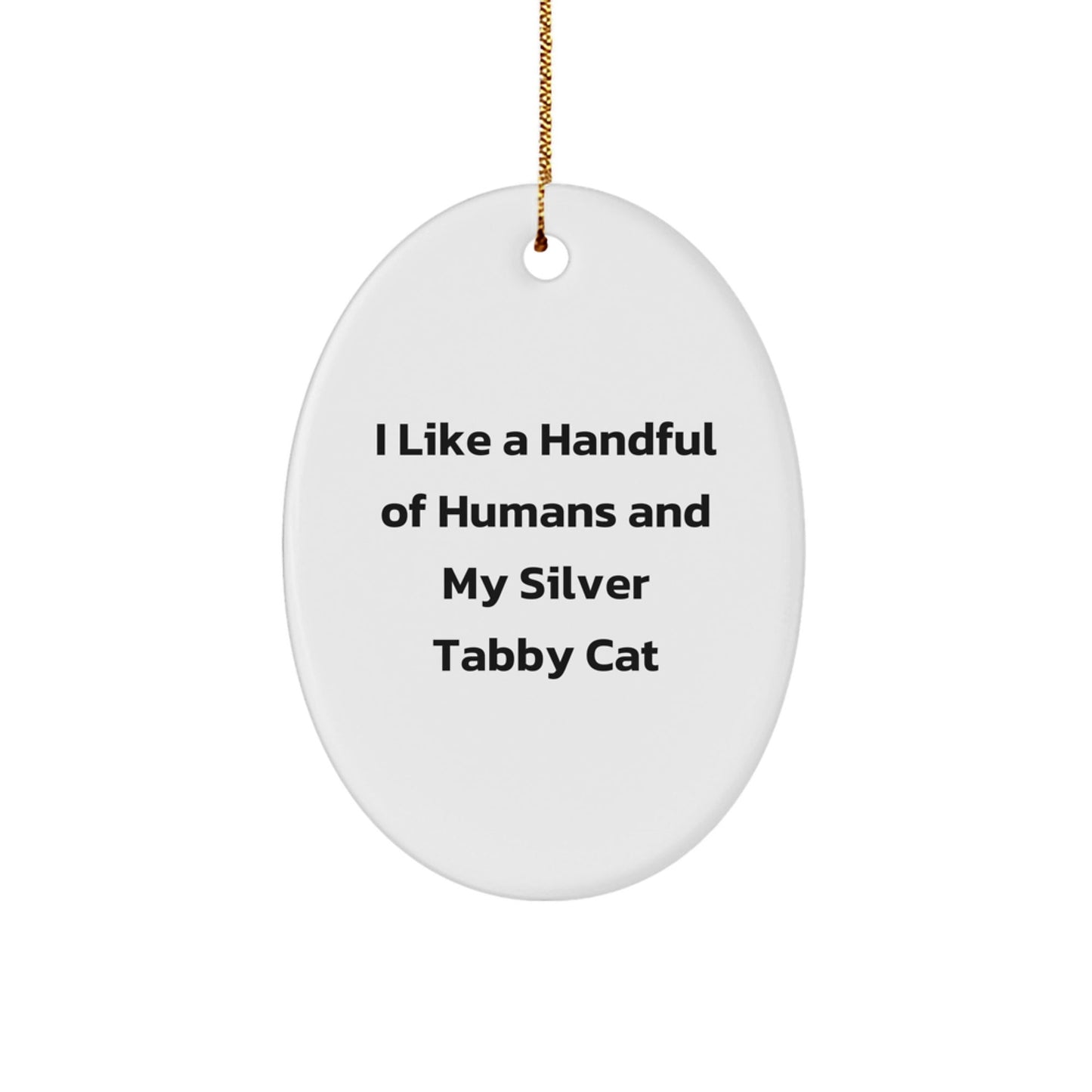 Whether you're a friend, family member, or coworker, this Silver Tabby Cat Oval Ornament is a thoughtful gift for Christmas. The quote 'I Like A Handful Of Humans And My Silver Tabby Cat' is a funny and heartwarming message that any cat lover will appreciate. So why not spread some joy this holiday season and give a gift that will be cherished for years to come?