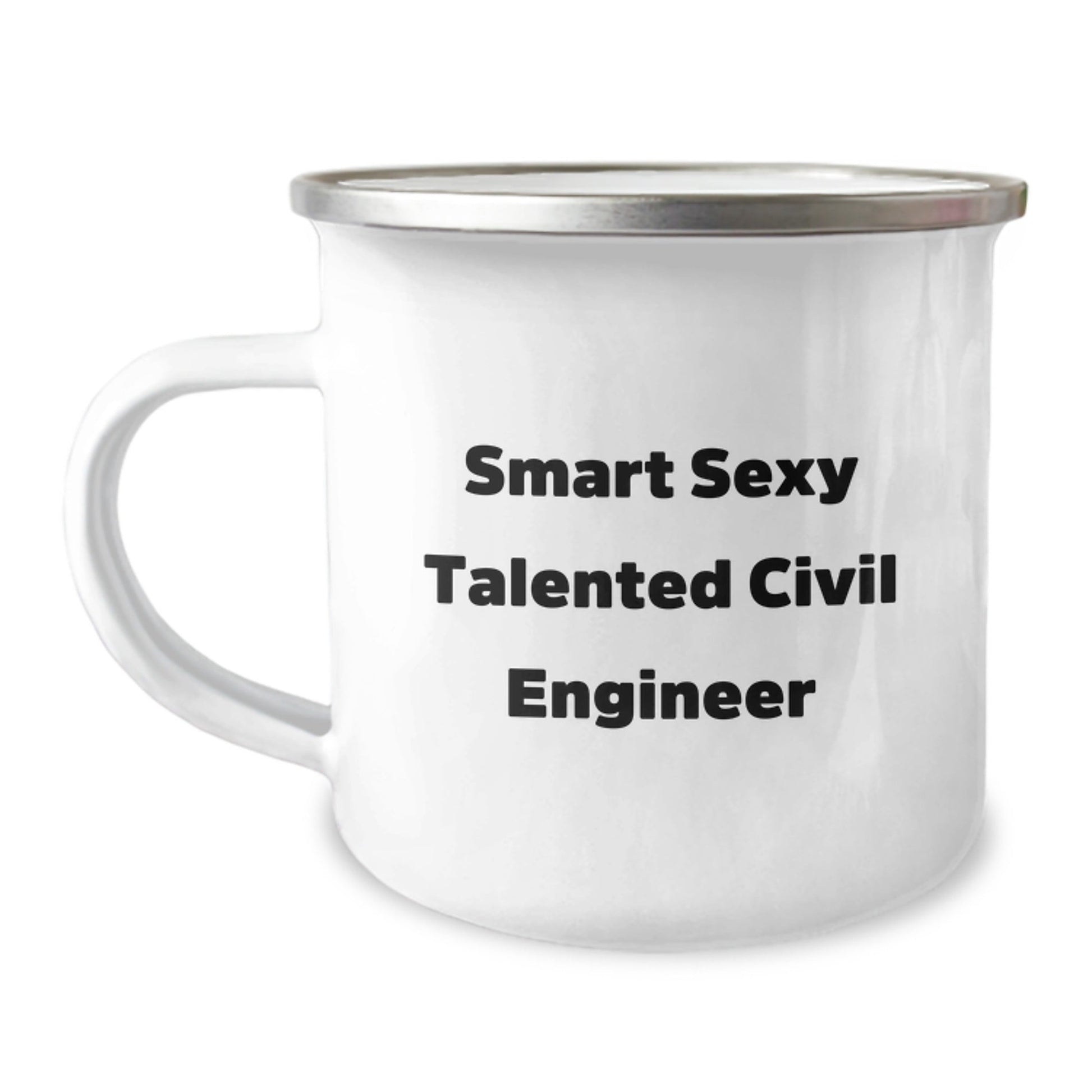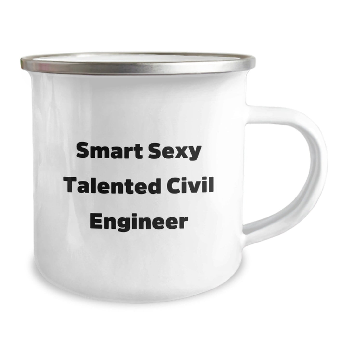 Are you a Civil Engineer looking for a unique gift or a thoughtful way to celebrate a birthday? Look no further! Our Smart Sexy Talented Civil Engineer Camping Mug is the perfect way to showcase your profession and love for the outdoors. Whether you're a seasoned camping or just starting out, this 12 oz stainless steel mug with enamel finish is designed to keep your drinks hot or cold for hours. And with permanent printing, the quote 'Smart Sexy Talented Civil Engineer' won't fade after washing. It's a thoughtful gift from you to the talented Civil Engineer in your life, perfect for a birthday celebration or any occasion. The sender of this gift is sure to impress the recipient with this unique and personalized present. The smart and sexy Civil Engineer in your life will appreciate the attention to detail and the fact that you understand their passion for their work. So why settle for an ordinary gift when you can give a gift that's truly extraordinary? Buy this Civil Engineer Camping Mug today and make it a birthday to remember!