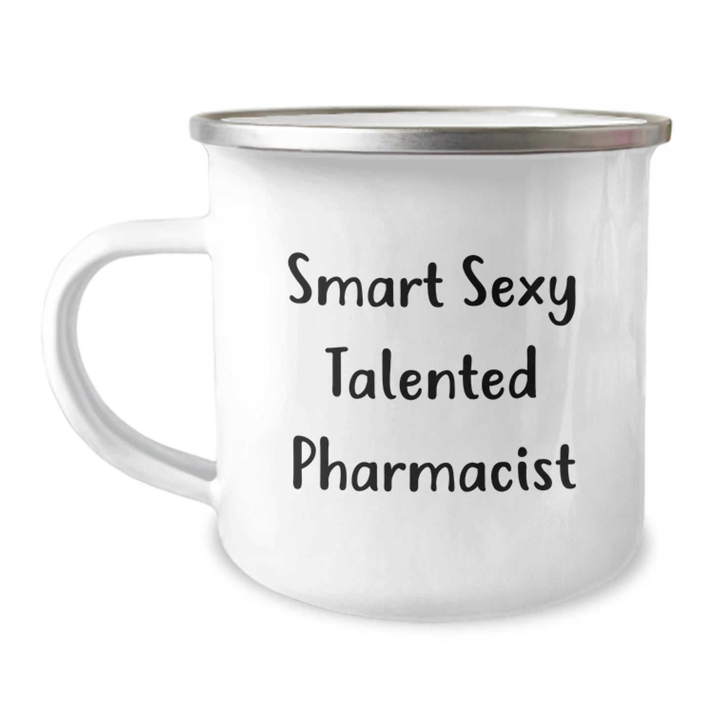 - Indulge in a 'Smart Sexy Talented Pharmacist' approved camping experience with this 12 oz stainless steel mug, featuring a permanent enamel finish that won't fade after washing. Perfect for your next outdoor adventure, this camping mug is easy to clean and maintain, ensuring a hygienic drinking experience for the pharmacist in your life.