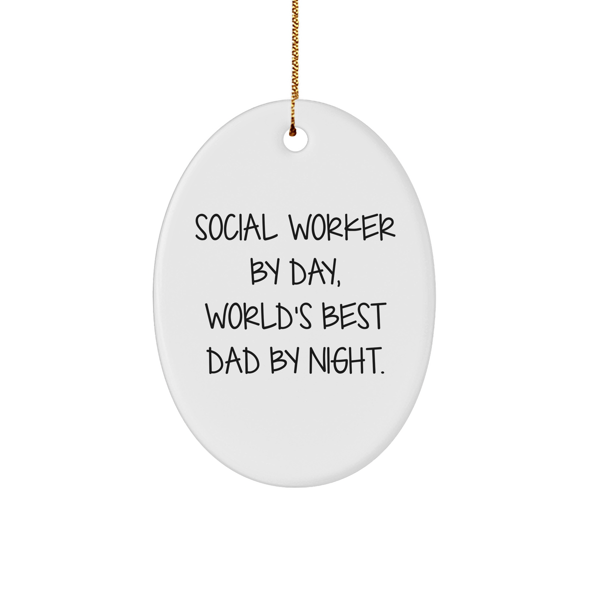 - This funny oval ornament is a unique and thoughtful gift for any social worker in your life, featuring the quote 'Social Worker By Day, World's Best Dad By Night.'