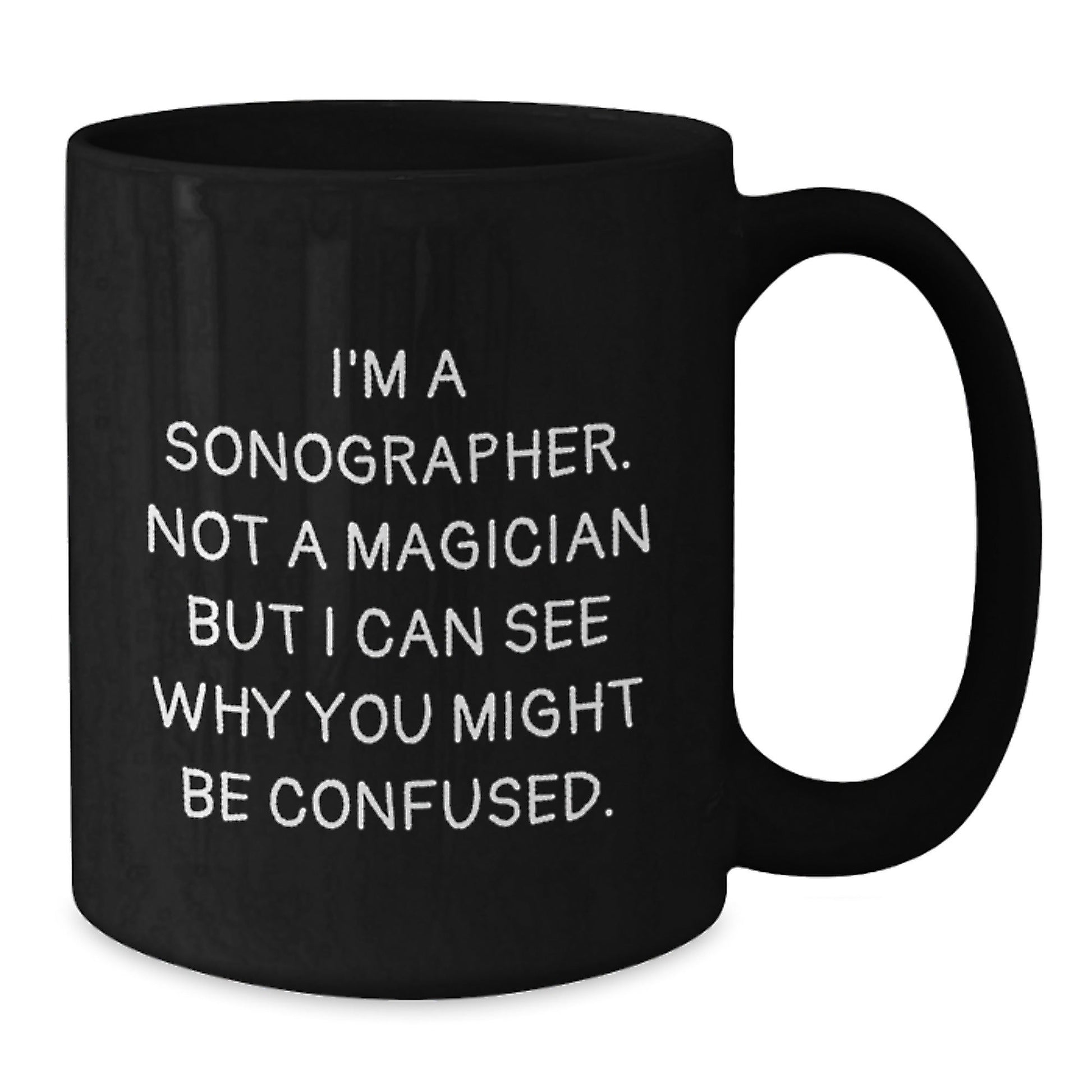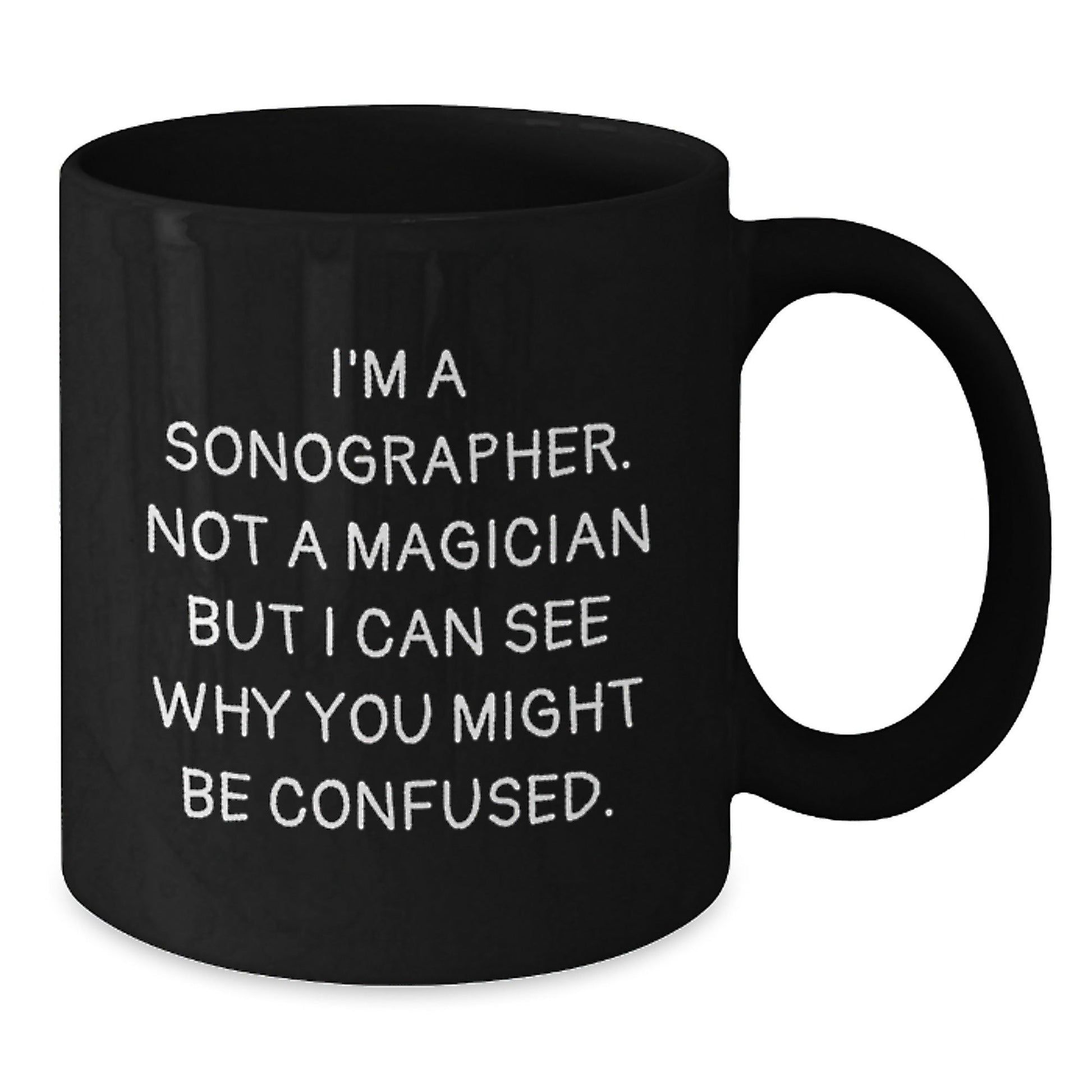 - This funny black coffee mug is a unique and thoughtful gift for sonographers, featuring the quote 'I'm A Sonographer. Not A Magician But I Can See Why You Might Be Confused.'