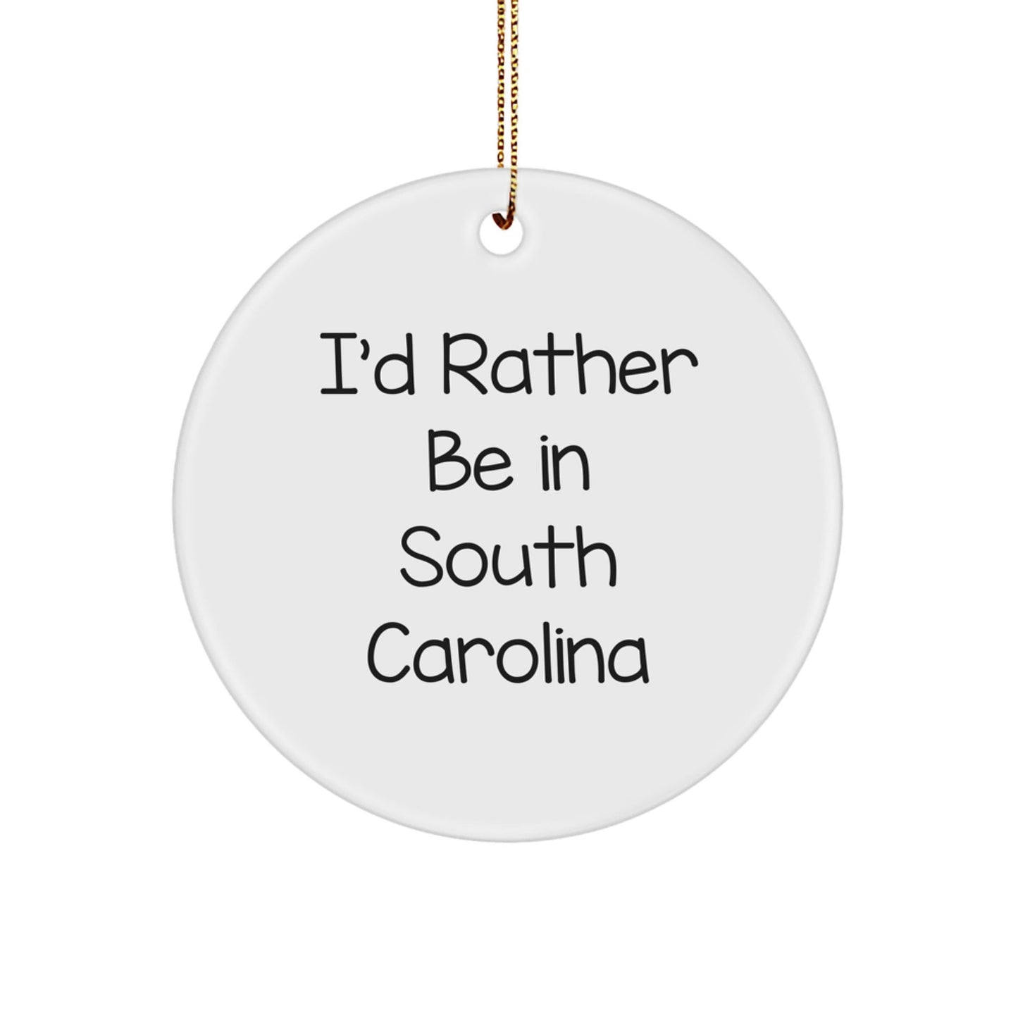 - Make a statement this holiday season with our South Carolina Circle Ornament, featuring a beautiful 'I'd Rather Be In South Carolina' quote that's sure to spark conversations. The perfect addition to your Christmas decorations, this ornament is crafted from high-quality materials for long-lasting durability.