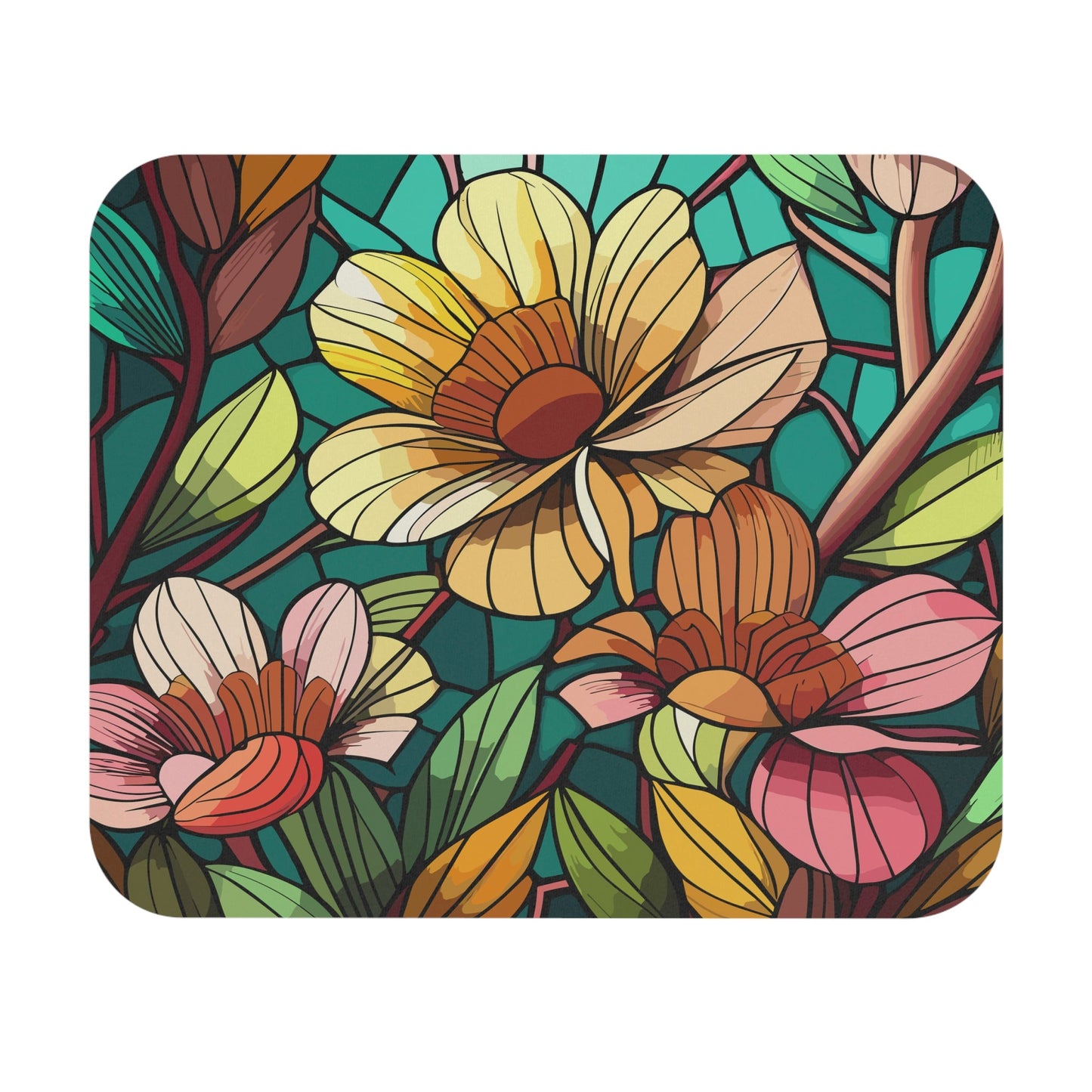 This Mouse Pad features a vibrant stained glass flowers design, adding a touch of elegance and color to your workspace. Perfect for flower lovers and those who appreciate artistic decor. Ideal for brightening up your desk during springtime, Mother's Day, or to simply add a pop of color to your work environment.