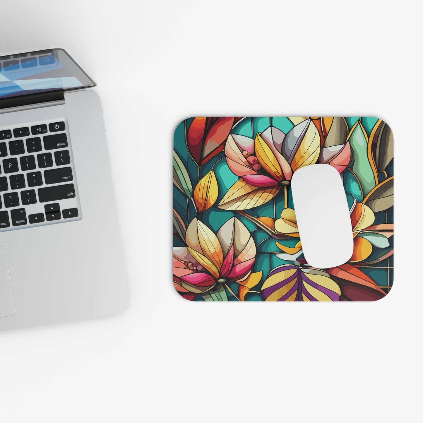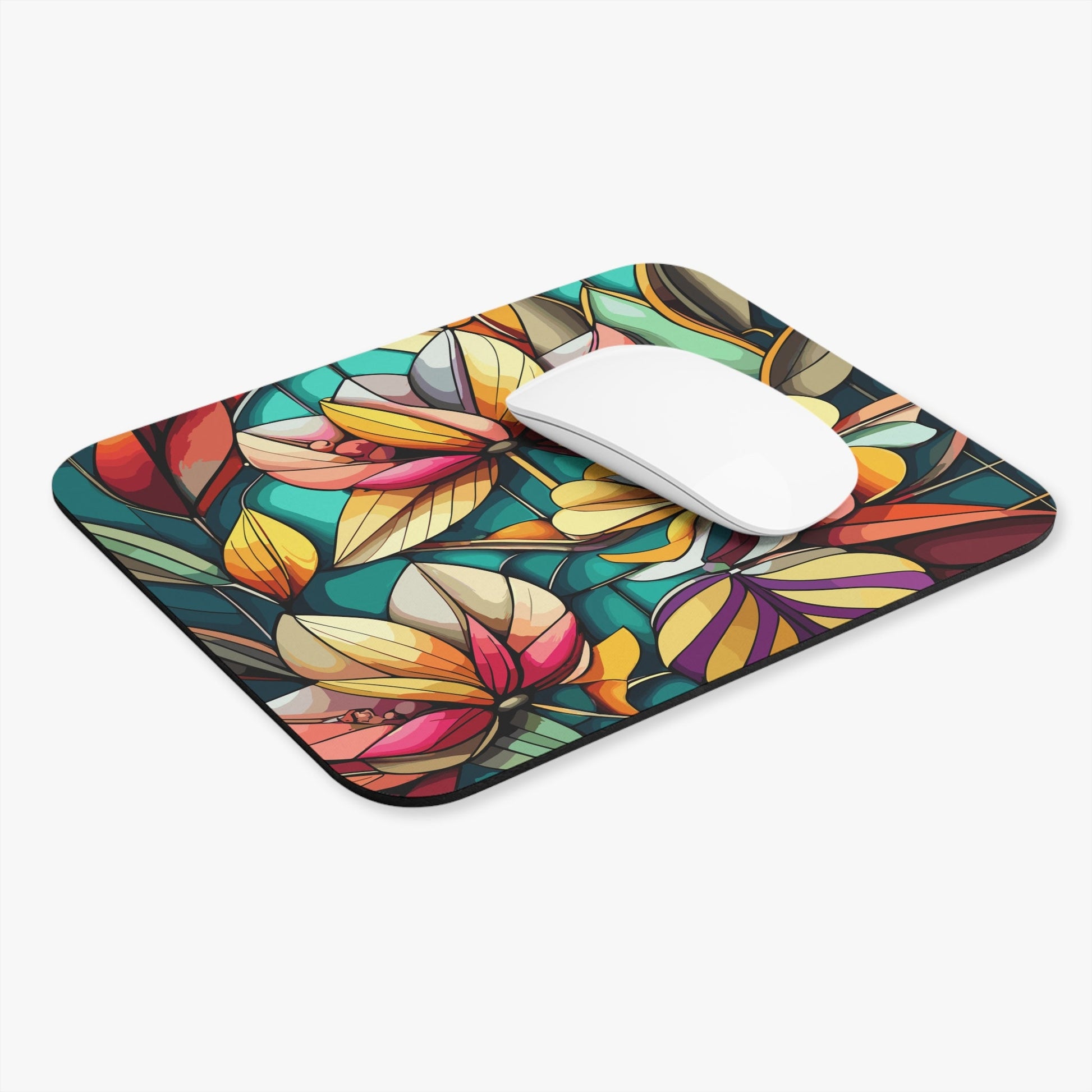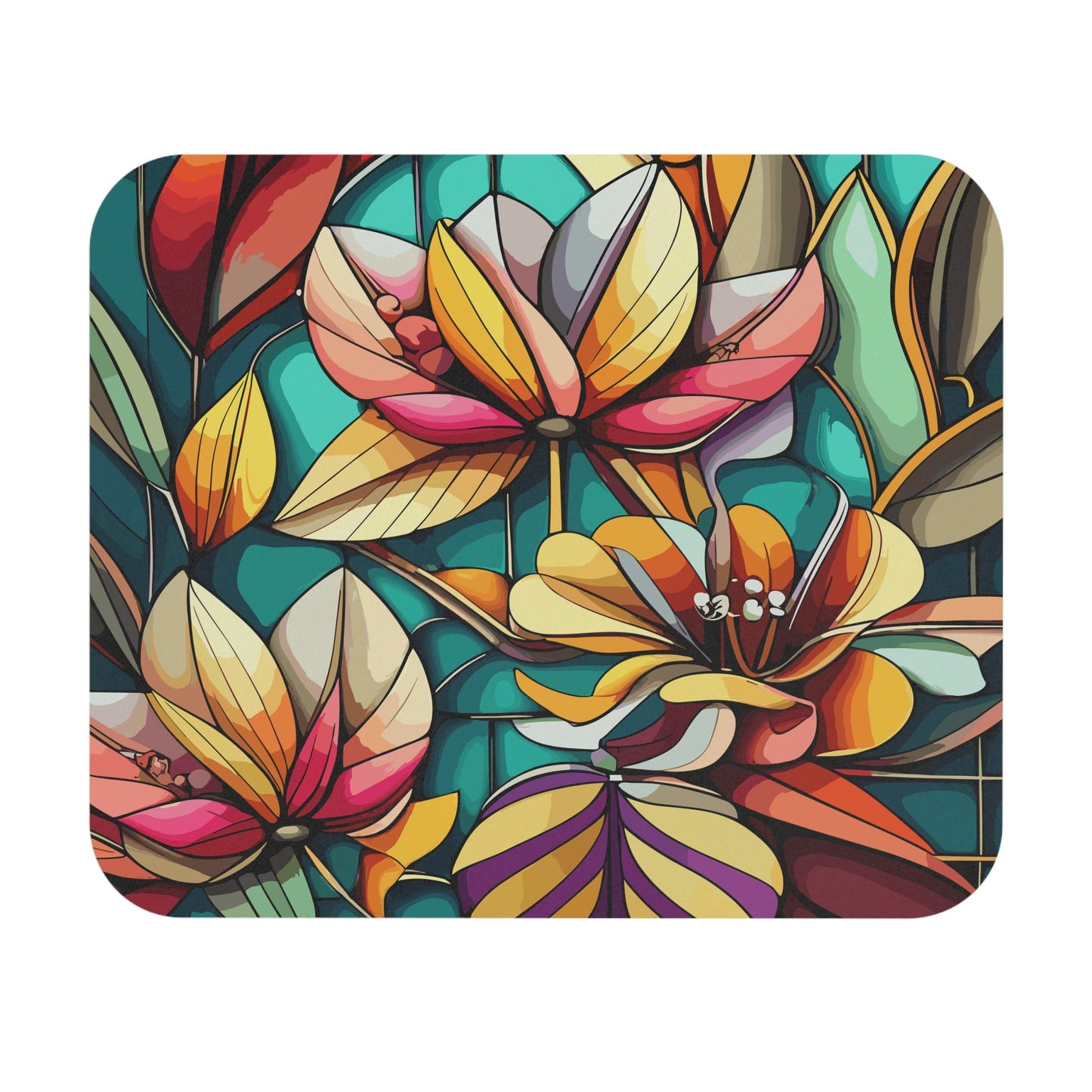 This stained glass flowers mouse pad features bright and intense colors for a vibrant and artistic vibe. Perfect for adding a pop of color to your workspace, this mouse pad is ideal for artists, floral enthusiasts, and anyone who appreciates unique and colorful designs. Great for birthdays, holidays, or simply refreshing your desk decor.