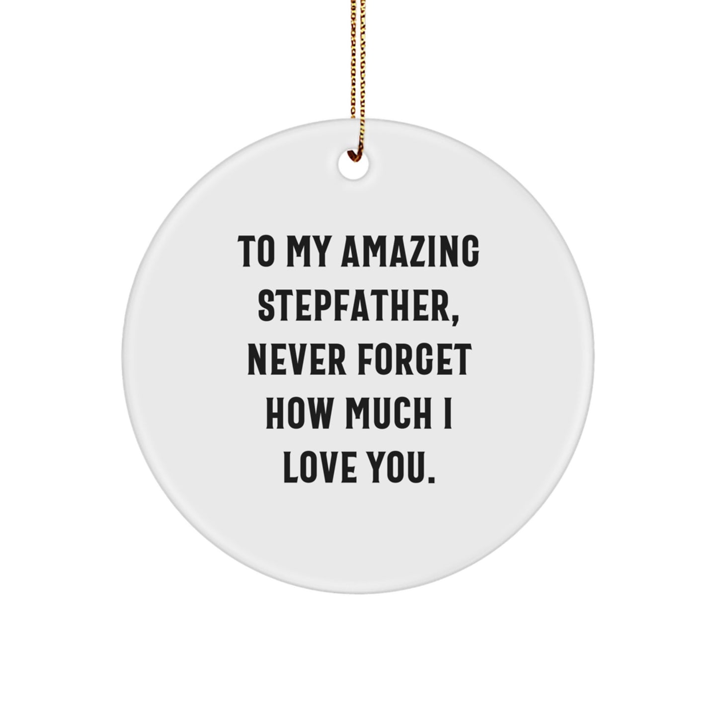 Are you looking for a special gift for your amazing stepfather? This funny circle ornament is the perfect way to show him how much you care. 'To My Amazing Stepfather, Never Forget How Much I Love You' is a heartwarming quote that will make him smile. Made from sturdy MDF with a high-gloss plastic finish, this ornament is lightweight and resistant to breaking, making it a great choice for households with children or pets.
