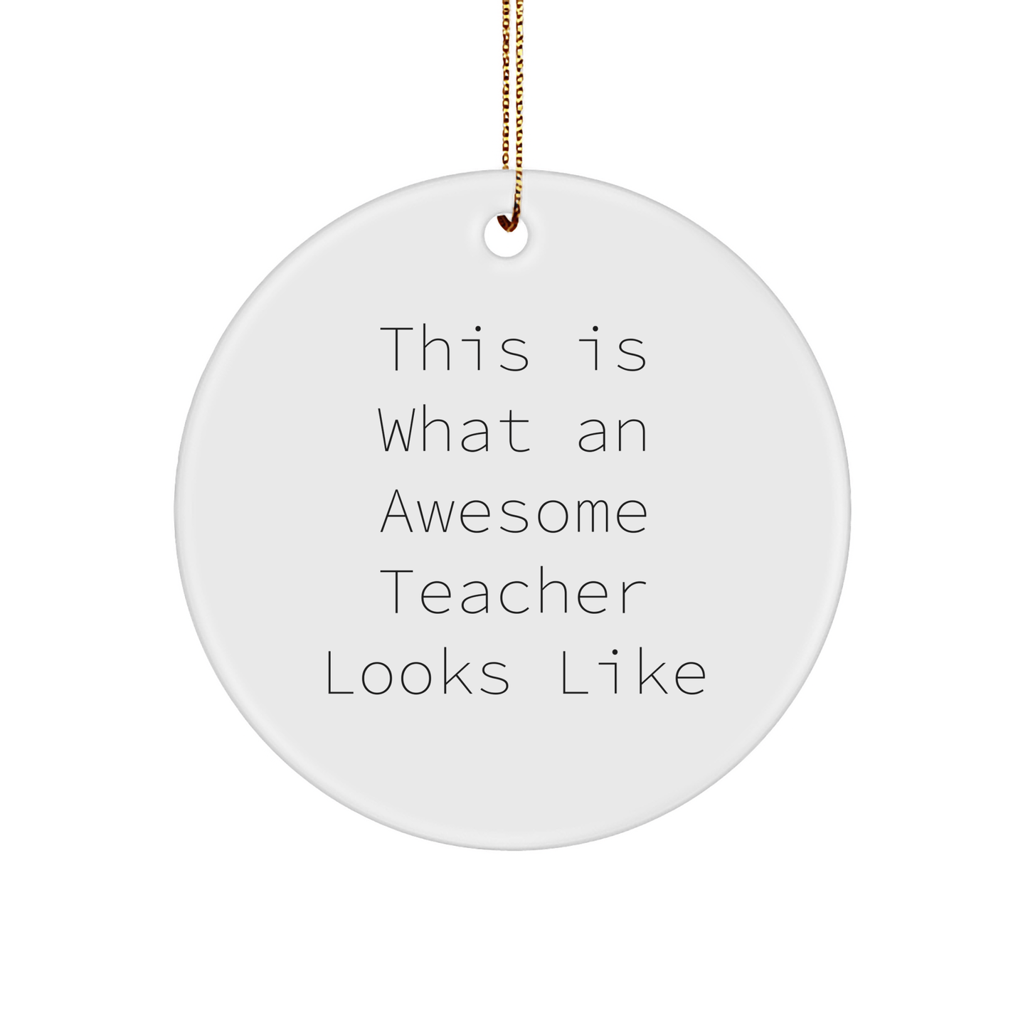 Get ready to make your favorite teacher's Christmas even more special with this hilarious and heartwarming circle ornament! The quote 'This Is What An Awesome Teacher Looks Like' is the perfect way to show your appreciation for all that they do. As a teacher, they deserve a gift that's both unique and meaningful, and this Circle Ornament checks all the boxes. Made from sturdy MDF with a high-gloss plastic finish, it's a great choice for households with children or pets. Plus, it ships with a festive gold cord for easy hanging. Whether you're a student, parent, or colleague, this gift is sure to bring a smile to your teacher's face. So why wait? Don't miss out and make this Christmas one to remember!