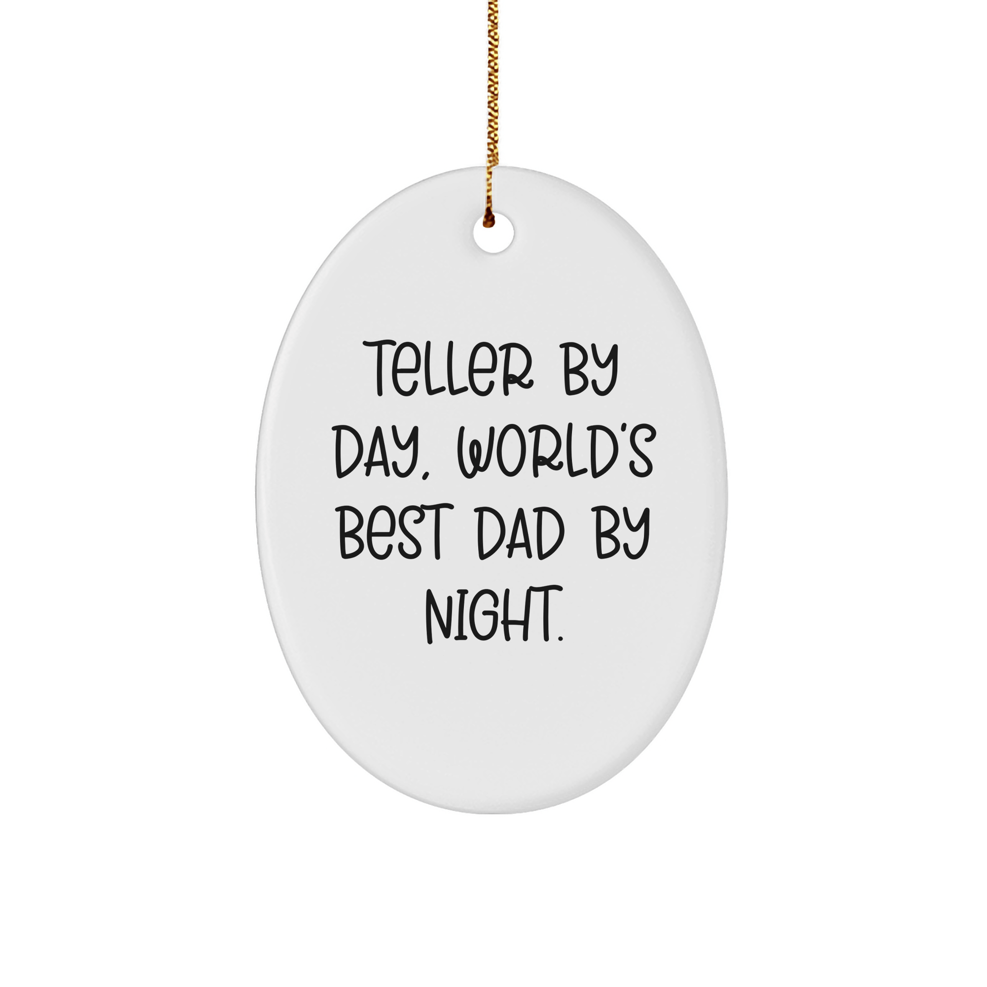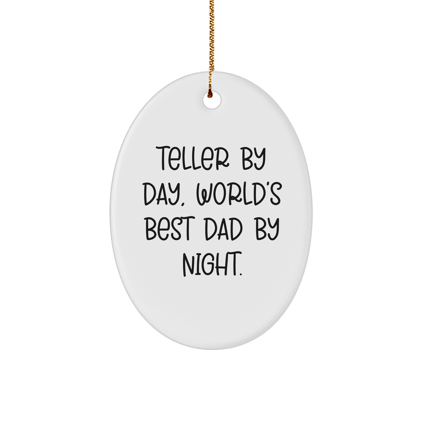 If you're looking for a unique gift for your favorite teller, this funny oval ornament is the perfect choice. With its vibrant design and high-gloss finish, it's sure to bring a smile to their face. The quote 'Teller By Day, World's Best Dad By Night.' is a great way to express your appreciation for their hard work and dedication. Whether you're a coworker, friend, or family member, this gift is sure to be a hit.