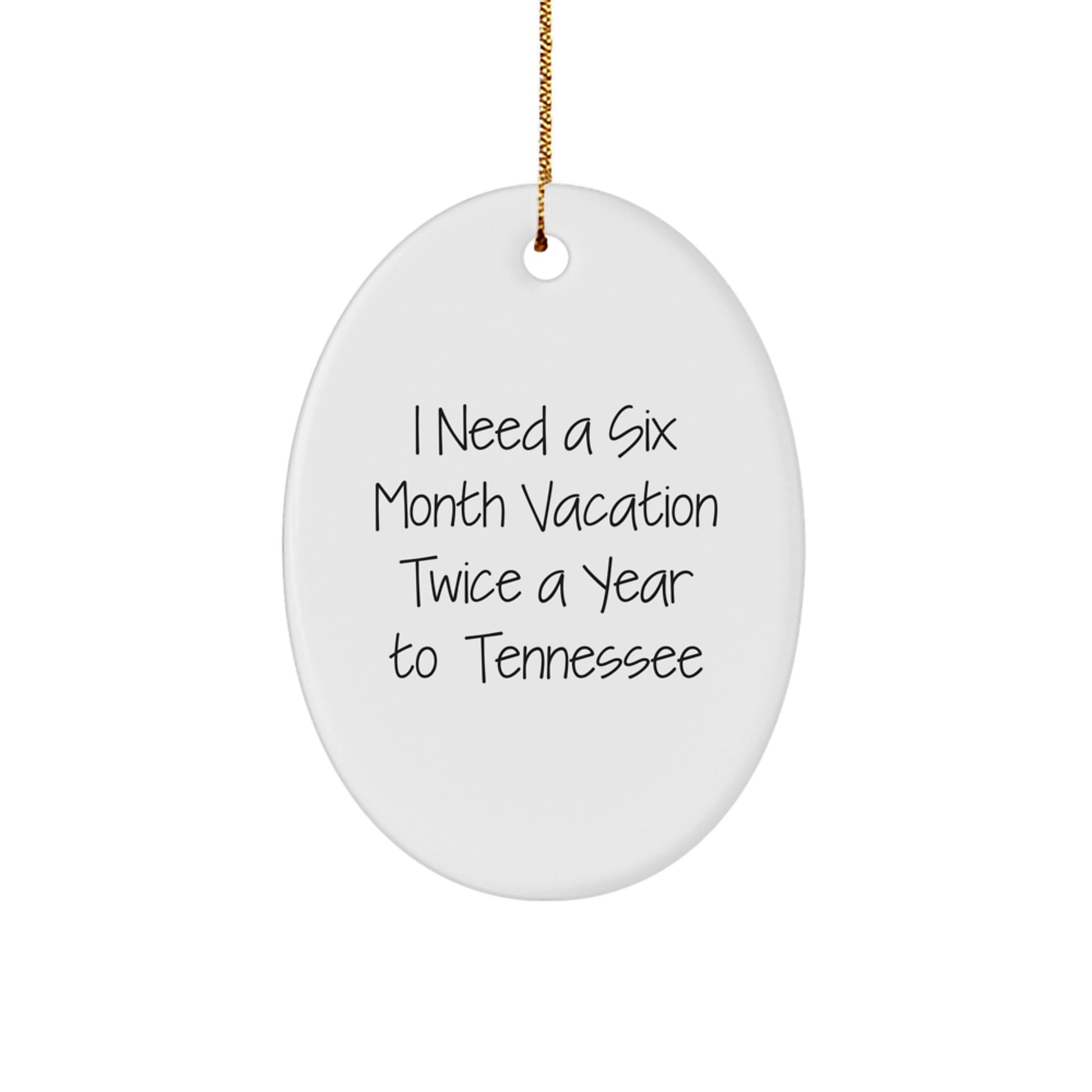- Make a thoughtful gift for your friends or family members who love Tennessee with this funny quote oval ornament. The quote reads 'I need a six month vacation twice a year to Tennessee' and is printed on a high-quality oval ornament made from sturdy MDF with a high-gloss plastic finish.