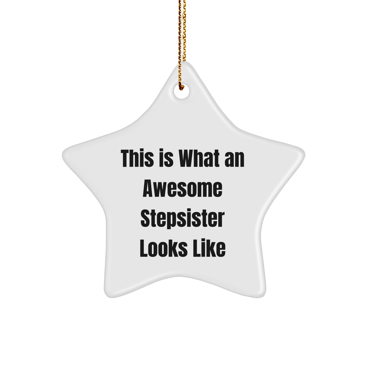 This amazing Star Ornament is the ideal gift for the awesome Stepsister in your life! The quote 'This Is What An Awesome Stepsister Looks Like' is a funny and relatable phrase that will make your Stepsister feel special. This White color, Star Shaped ornament is crafted from sturdy MDF with a high-gloss plastic finish, making it a long-lasting decoration for your home. It's lightweight, resistant to breaking, and perfect for households with children or pets. The festive gold cord makes it easy to hang, and it's a great addition to your Christmas decorations.