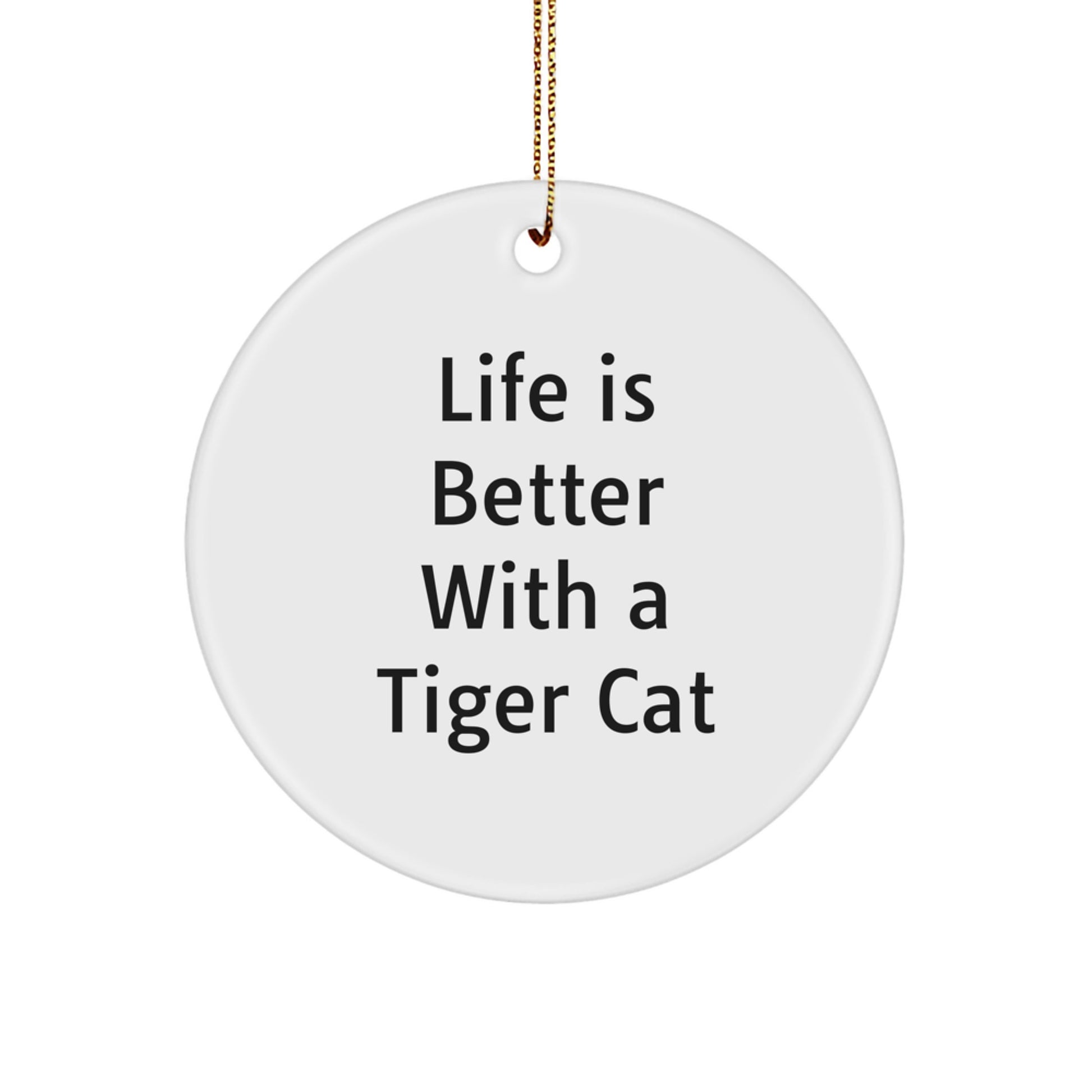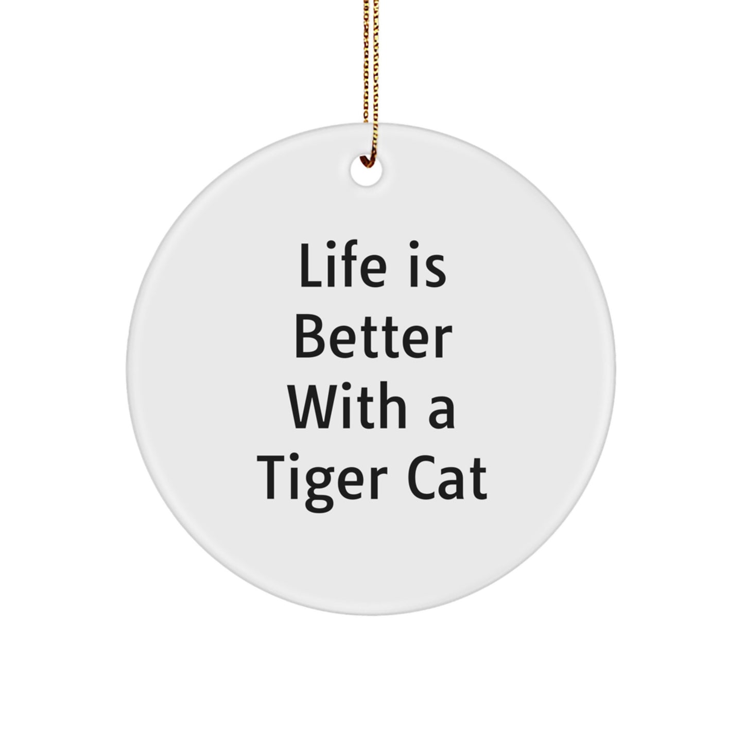 - Add a touch of humor and whimsy to your holiday decor with this funny Tiger Cat Circle Ornament, featuring the quote 'Life Is Better With A Tiger Cat' in bright, vivid colors.