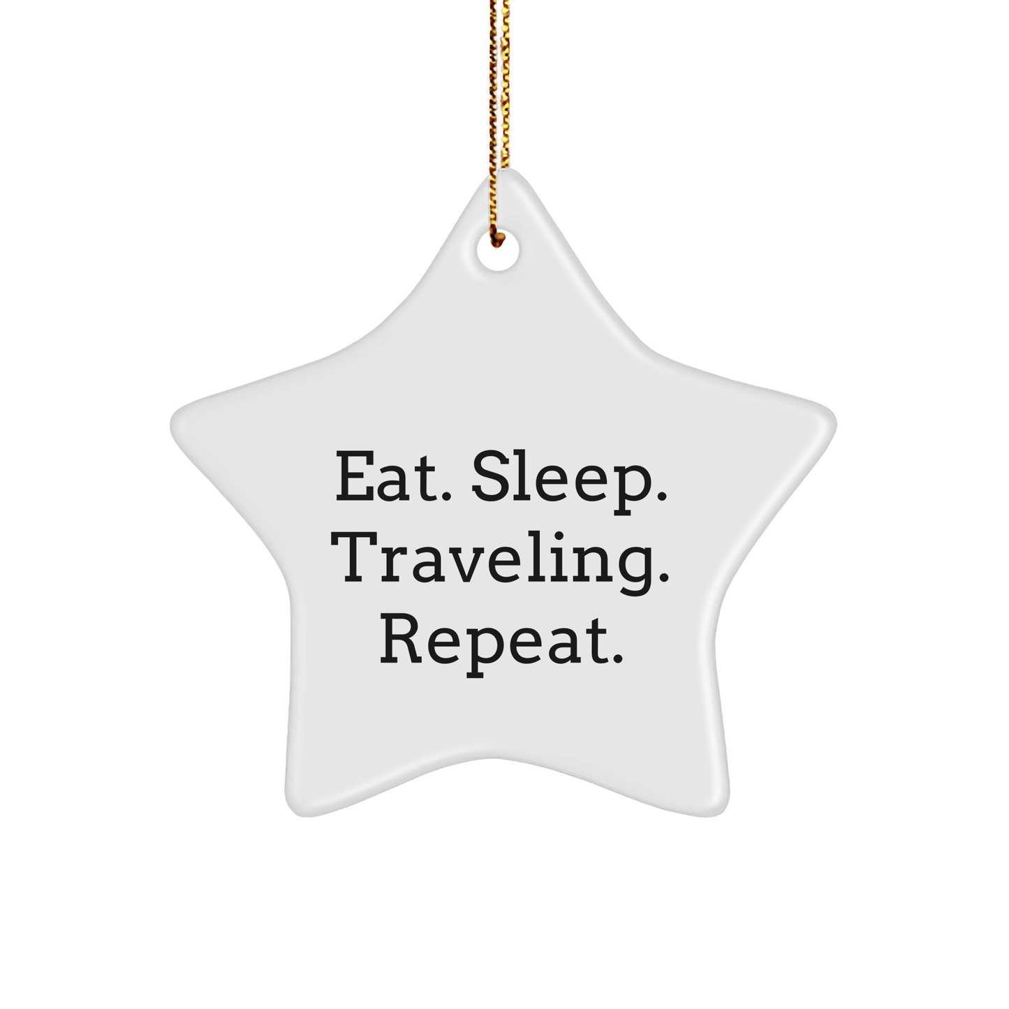 This Star Ornament is a thoughtful gift for anyone who loves to travel. Its unique design and message will resonate with any travel enthusiast, making it a memorable and special gift. Give it as a present to your friends, family, or coworkers, and watch them light up with excitement. This Star Ornament is perfect for hanging on the Christmas tree, in a window, or in a cozy corner of the home. It's a wonderful way to celebrate the holiday season and the joy of traveling. So why wait? Get your Eat. Sleep. Traveling. Repeat. Star Ornament today and make a lasting impression on your loved ones.