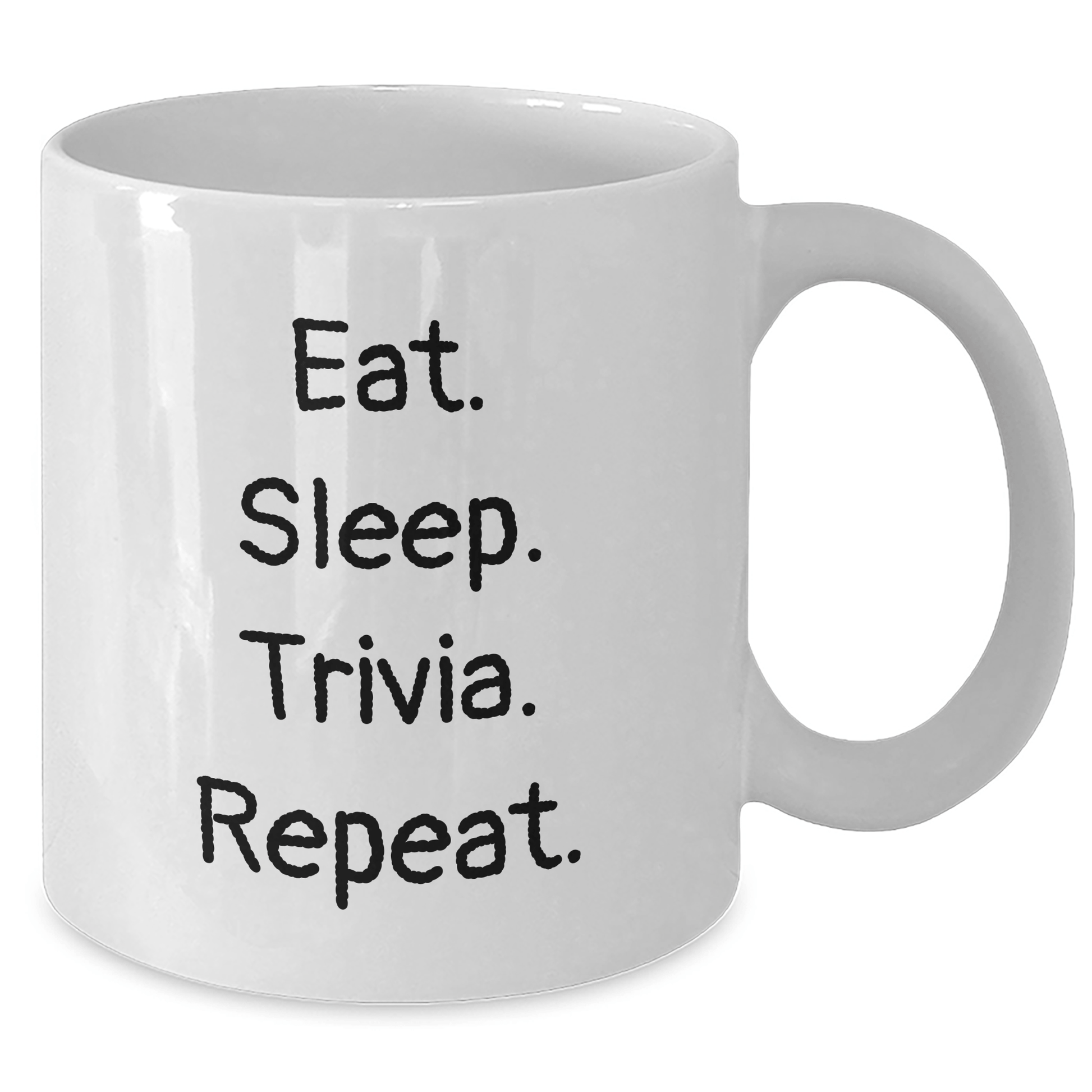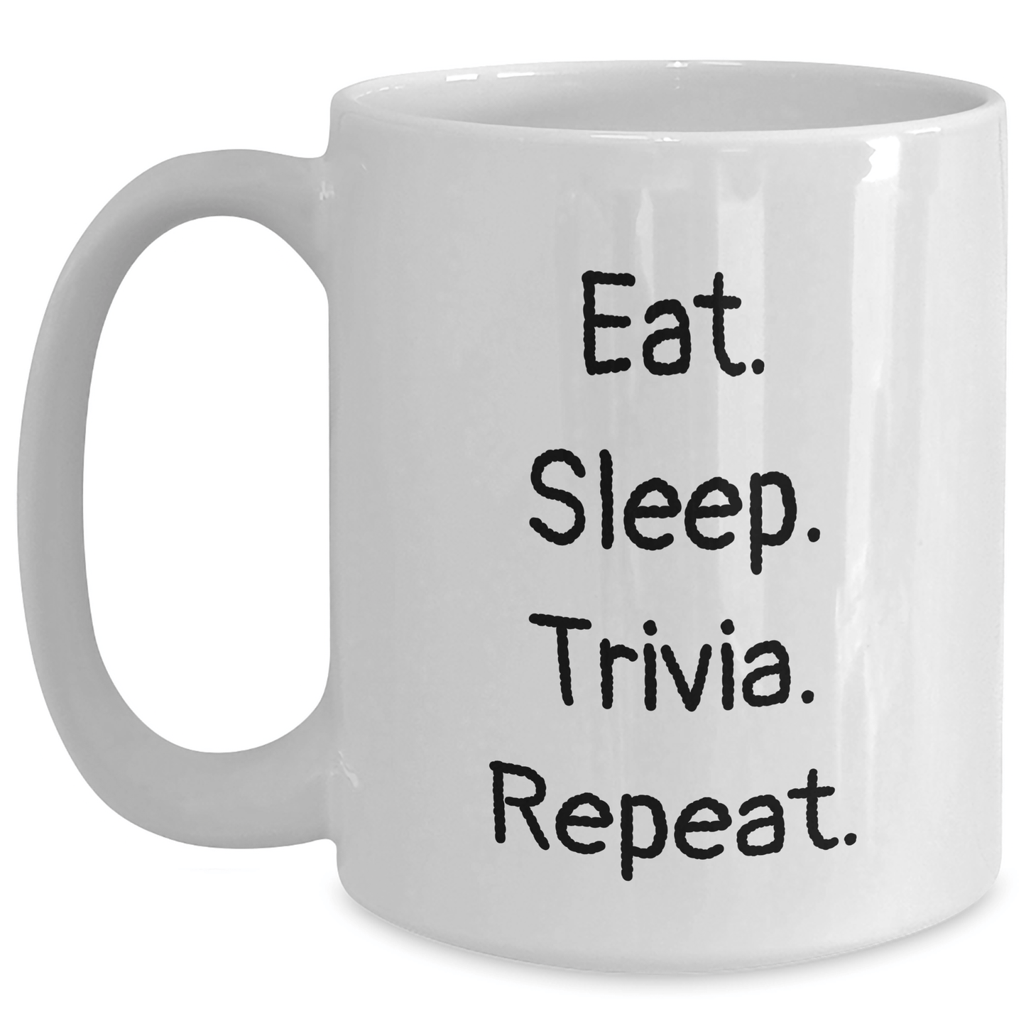 - Trivia lovers, rejoice! This white coffee mug is designed to inspire you to 'Eat. Sleep. Trivia. Repeat.' Made from high-quality ceramic, it's durable, easy to clean, and perfect for daily use. Plus, its unique design ensures you'll never forget the fun times you've had with friends and family.