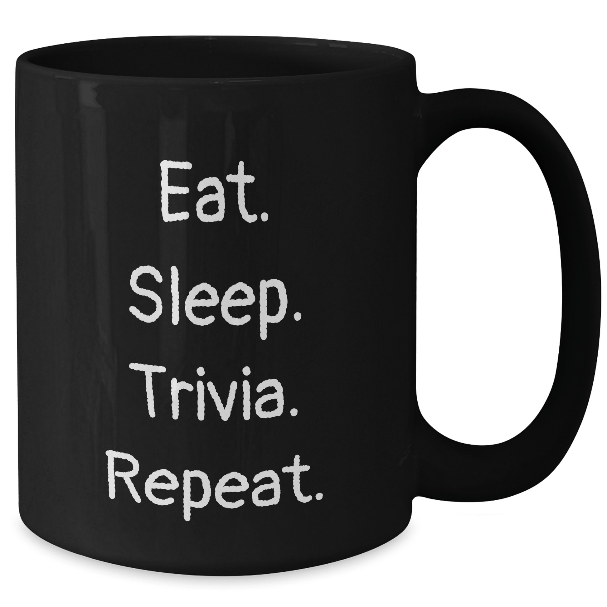 - This Black Coffee Mug is the ideal gift for trivia enthusiasts, featuring an inspirational quote that will motivate them to keep going: 'Eat. Sleep. Trivia. Repeat.'