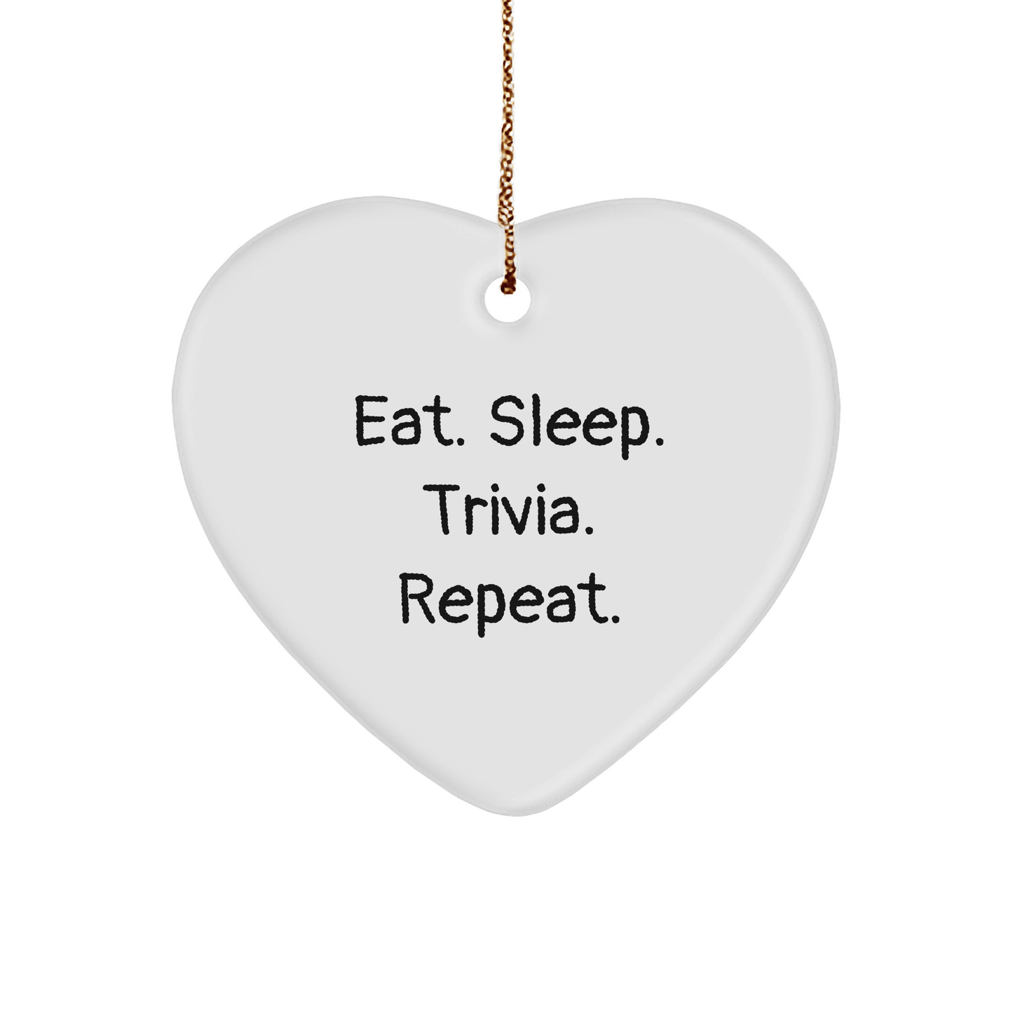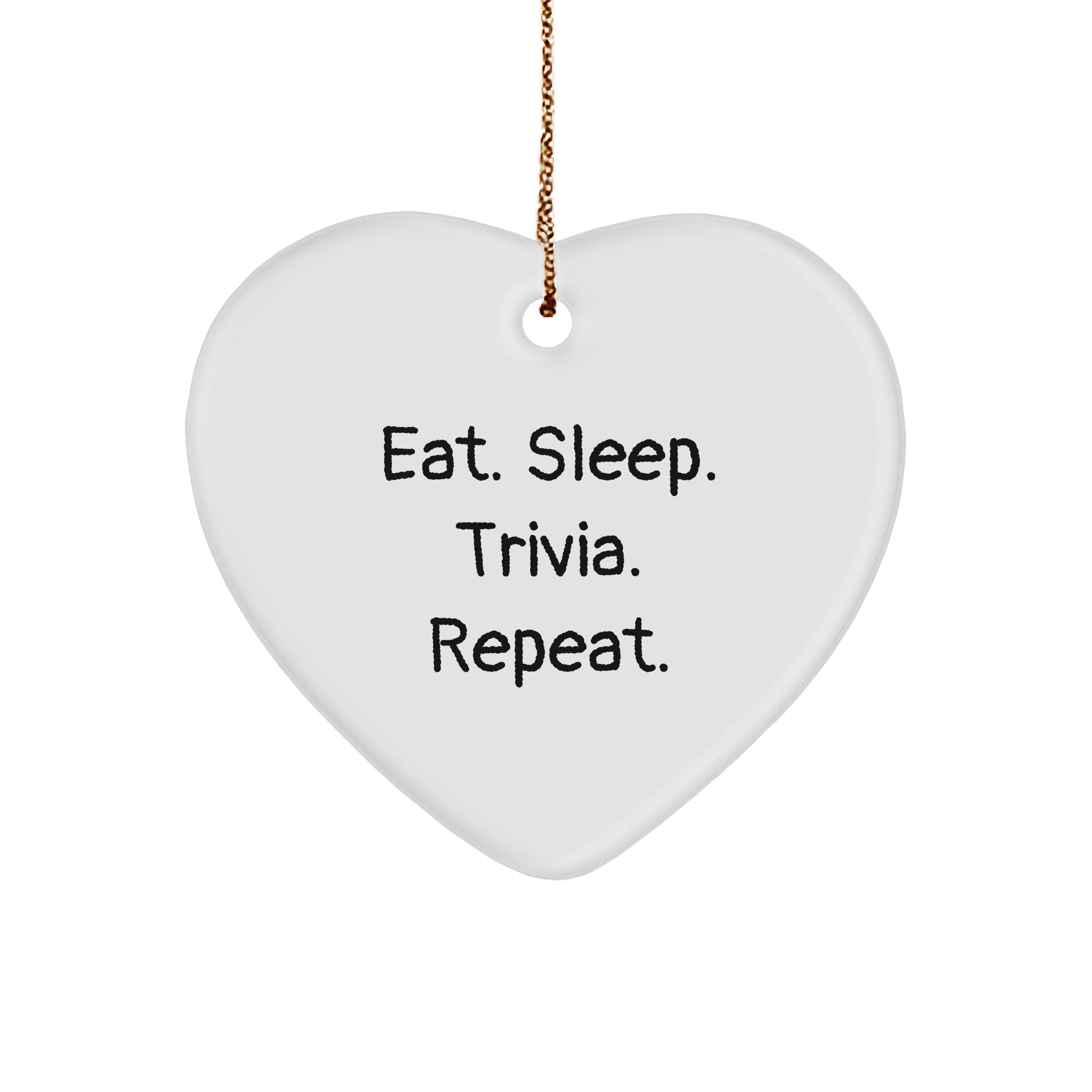 - Get your Eat. Sleep. Trivia. Repeat. Heart Ornament today and spread the love of trivia to those around you - perfect for friends, family, or coworkers!