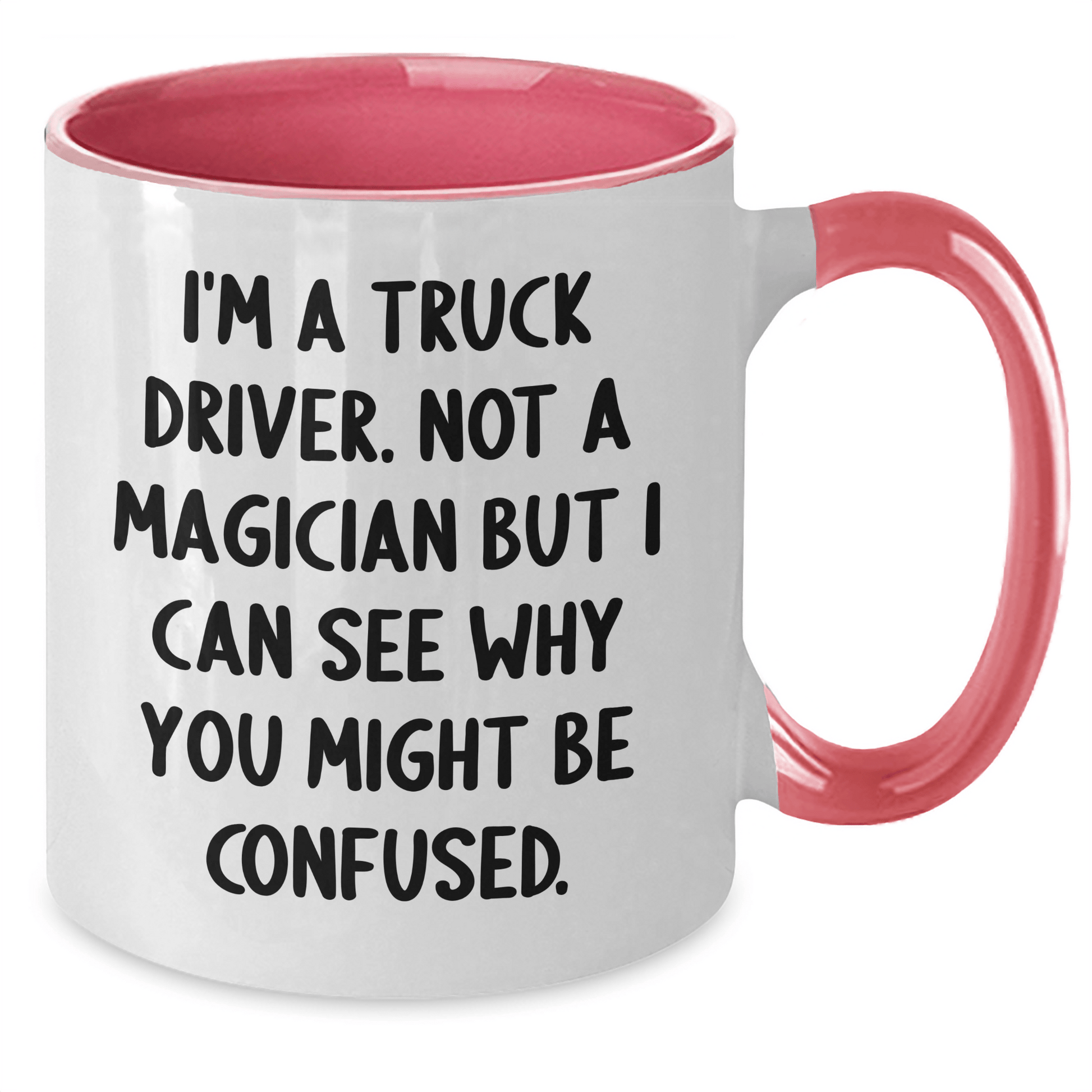 Are you looking for a unique gift for the truck driver in your life? Look no further! This funny two-tone coffee mug is the perfect way to show your appreciation for their hard work and dedication. With its humorous quote, 'I'm A Truck Driver. Not A Magician But I Can See Why You Might Be Confused.', this mug is sure to bring a smile to their face.