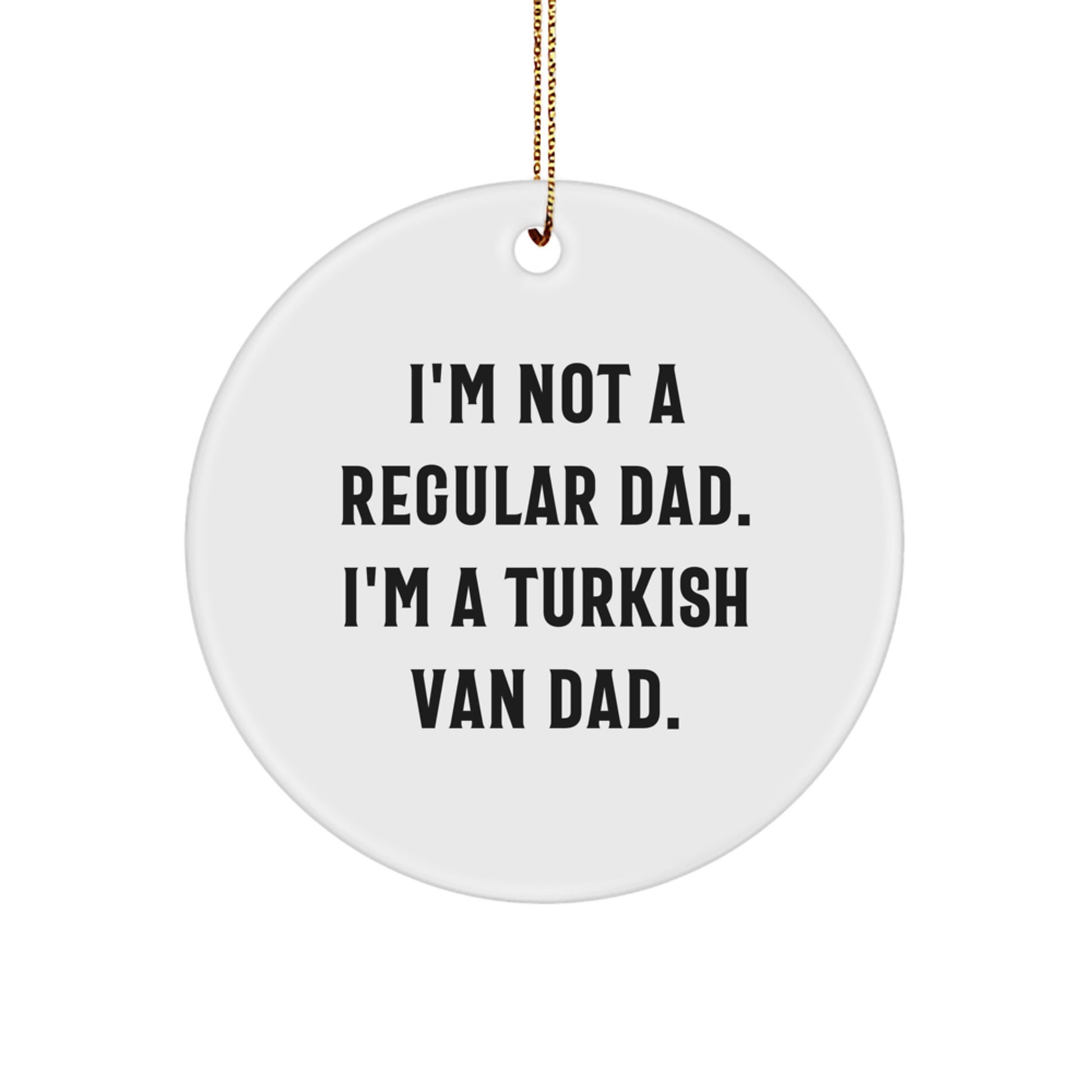 - Introducing a unique Turkish Van Cat circle ornament, crafted with love and precision, perfect for cat lovers and enthusiasts! This vibrant ornament is printed from edge-to-edge via Sublimation, ensuring bright, vivid colors that won't fade over time. 'I'm Not A Regular Dad. I'm A Turkish Van Dad.' quote adds a personal touch to your holiday decor.