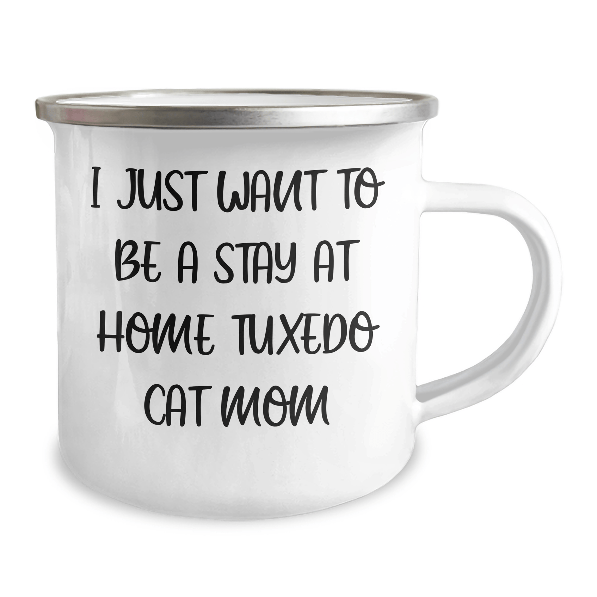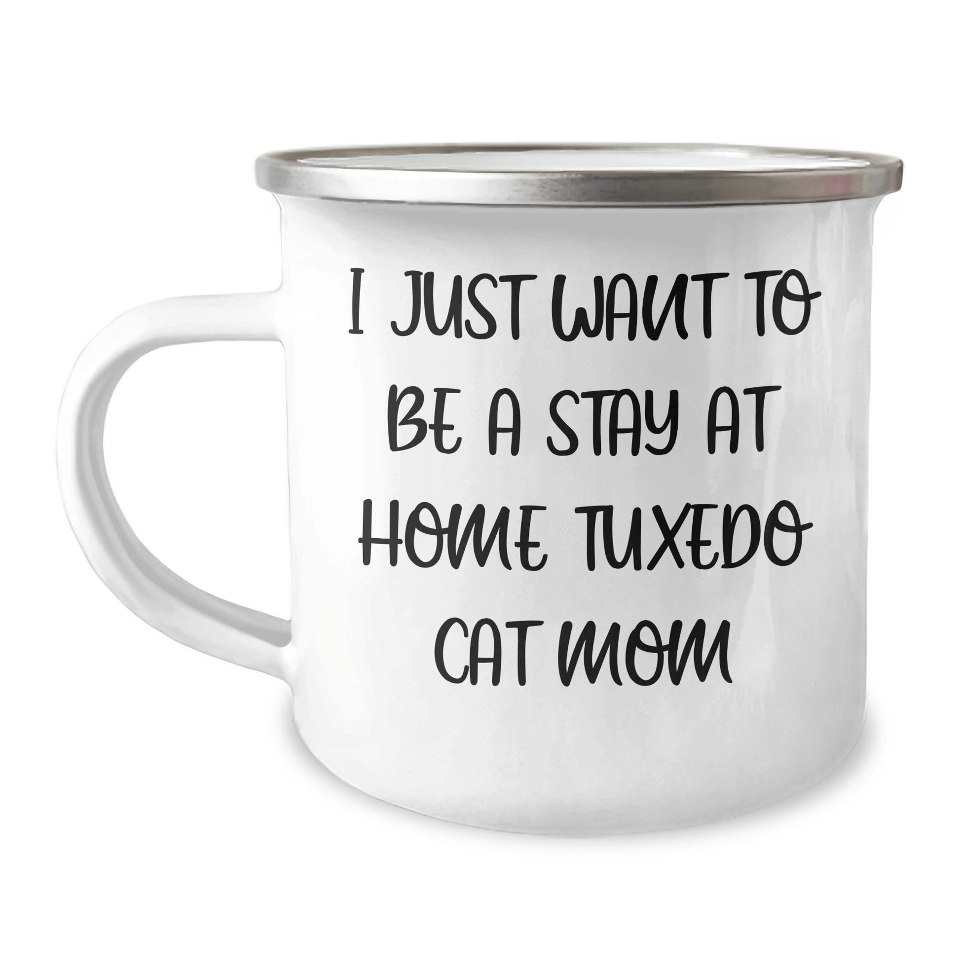 - This Camping Mug is a unique and thoughtful gift for any occasion, including Father's Day. The quote 'I Just Want To Be A Stay At Home Tuxedo Cat Mom' is a funny and relatable message that any Tuxedo Cat mom would love. The mug is designed with a stainless steel base and enamel finish, making it sturdy and easy to clean. Hand washing with mild detergent is recommended to ensure the longevity of the print.
