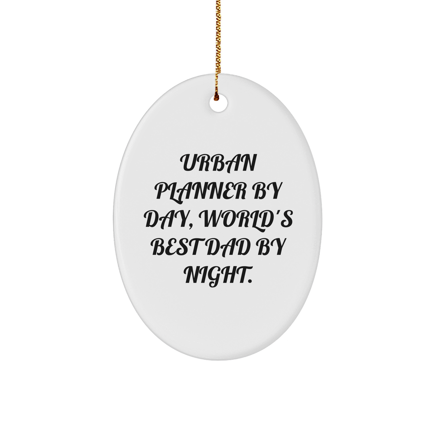 If you're looking for a unique gift for the urban planner in your life, look no further! This Oval Ornament is a thoughtful present that celebrates their passion for urban planning. The quote 'Urban Planner By Day, World's Best Dad By Night.' is a funny and heartwarming message that's perfect for any occasion. Made from sturdy MDF with a high-gloss plastic finish, this ornament is lightweight and resistant to breaking, making it a great choice for households with children or pets. Ships with a festive gold cord for easy hanging, perfect for stress-free decorating. Whether you're a friend, family member, or coworker, this gift is sure to bring a smile to their face. So why wait? Get this unique Christmas gift for the urban planner in your life today!