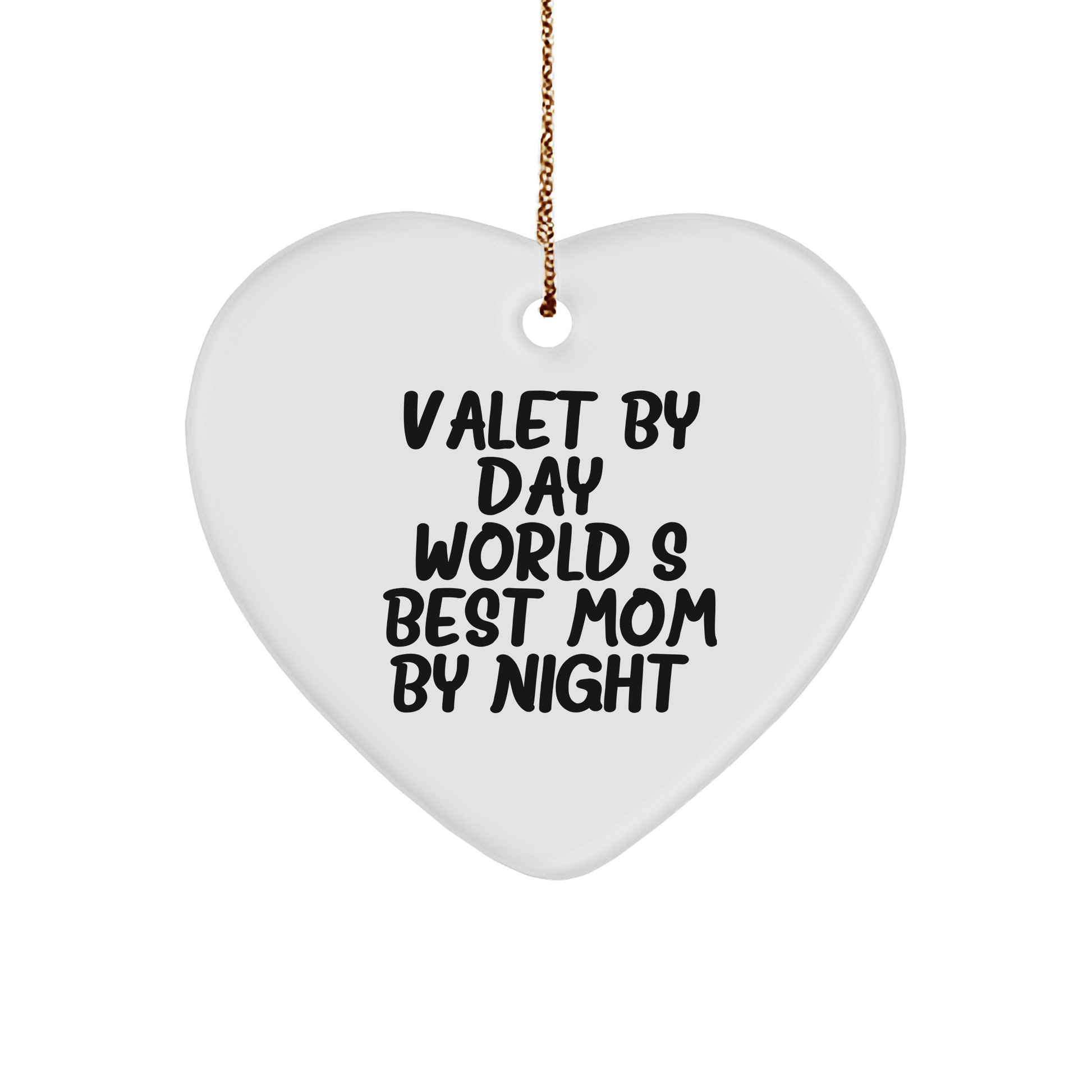 - Add a personal touch to your Christmas decorations with this heart-shaped ornament, featuring the quote 'Valet By Day, World's Best Mom By Night.' in a beautiful, vibrant print. Perfect for hanging on the tree, mantel, or anywhere else in your home.