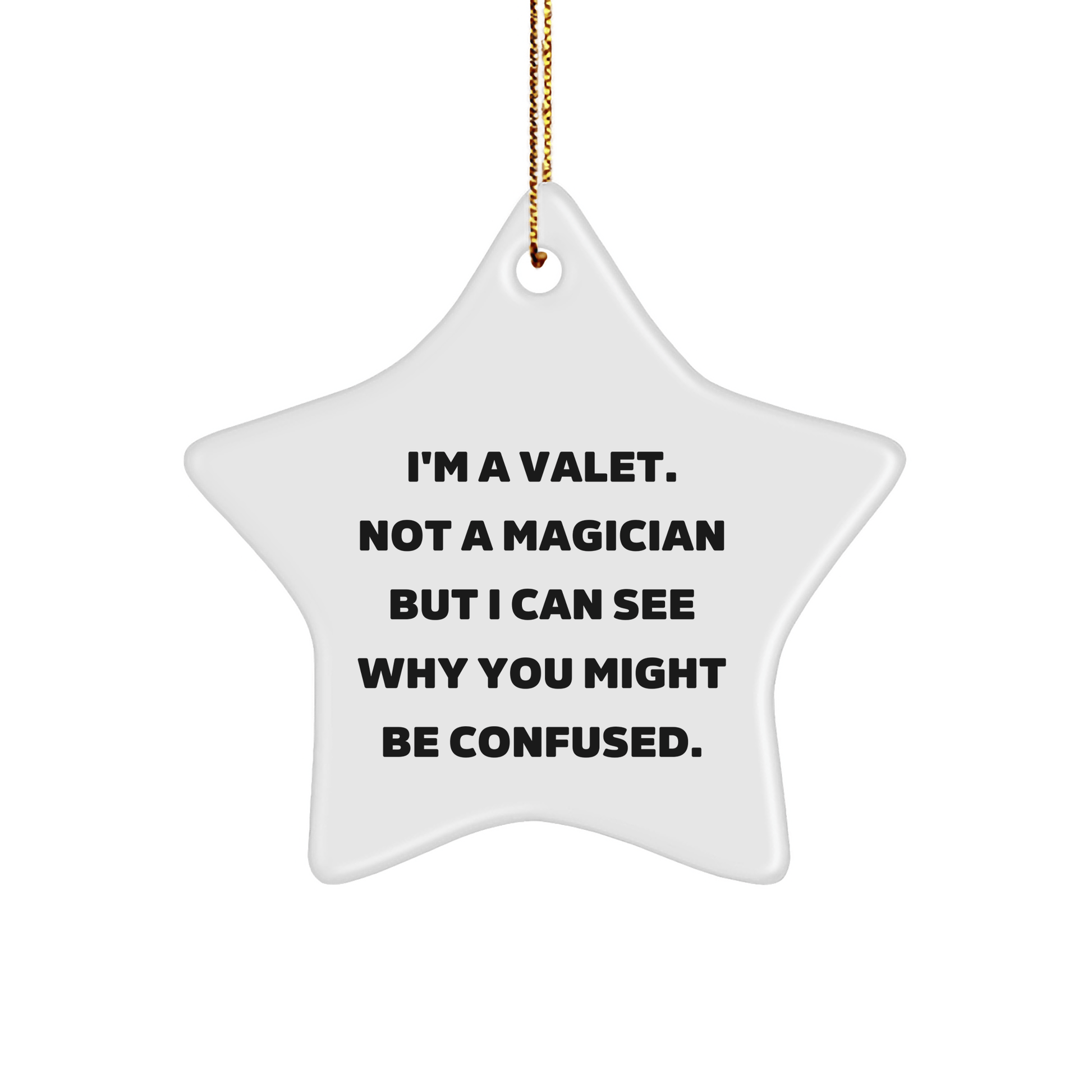 Are you looking for a unique and funny gift for your favorite Valet? Look no further! This 'I'm A Valet' Star Ornament is the perfect addition to any Valet's Christmas decorations. The quote 'I'm A Valet. Not A Magician But I Can See Why You Might Be Confused.' will bring a smile to their face. This sturdy MDF Star Ornament is crafted with a high-gloss plastic finish, ensuring bright, vivid colors. Perfect for households with children or pets, it's lightweight and resistant to breaking. Ships with a festive gold cord for easy hanging, making it a stress-free decorating experience. Give the gift of laughter and humor this Christmas with this Valet-themed Star Ornament.