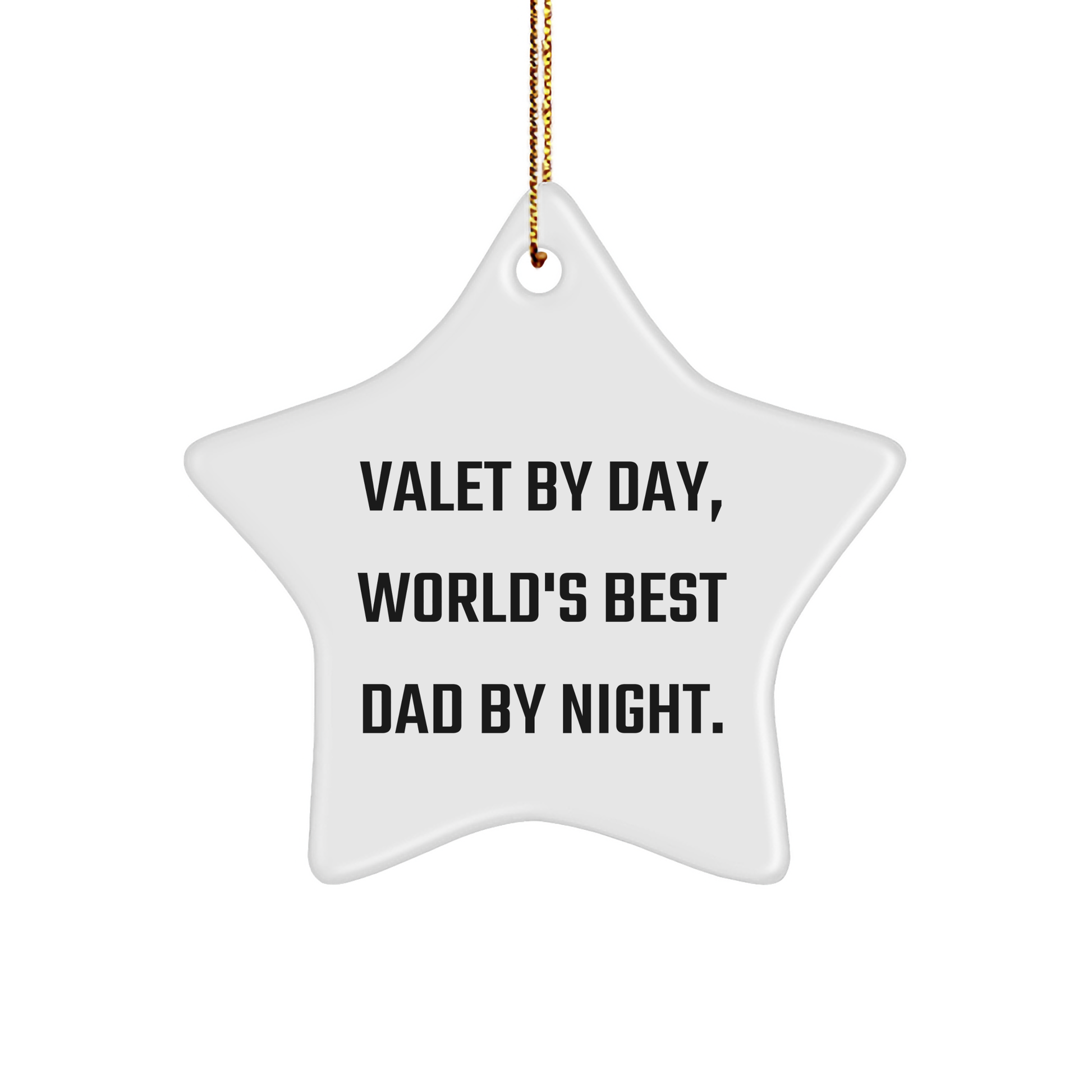 - This star ornament features a funny quote that says 'Valet by day, World's Best Dad by Night.' - a unique and thoughtful gift for the valet in your life.