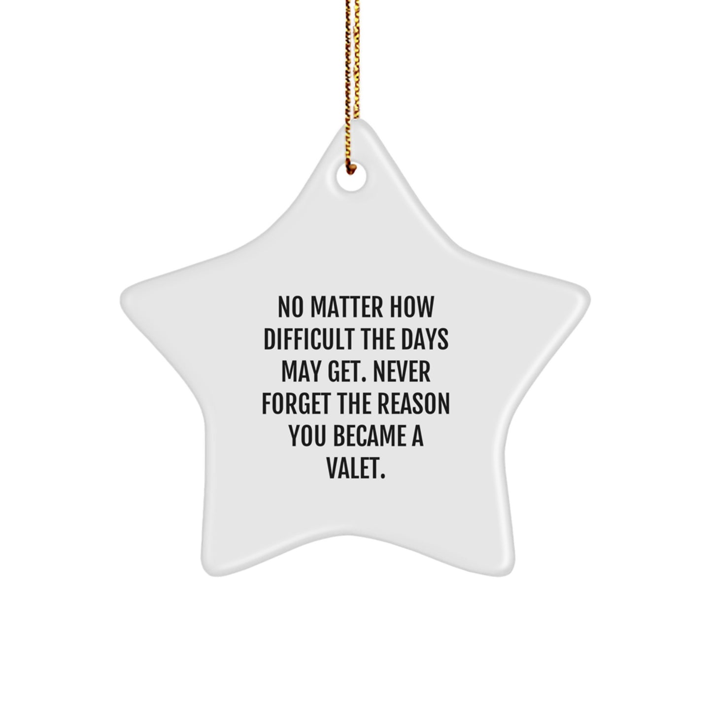 - This Valet Star Ornament is a perfect way to show your appreciation for the valet in your life who always keeps their spirits high despite the challenges they face. Its inspirational quote and beautiful design make it a thoughtful gift that will be treasured.