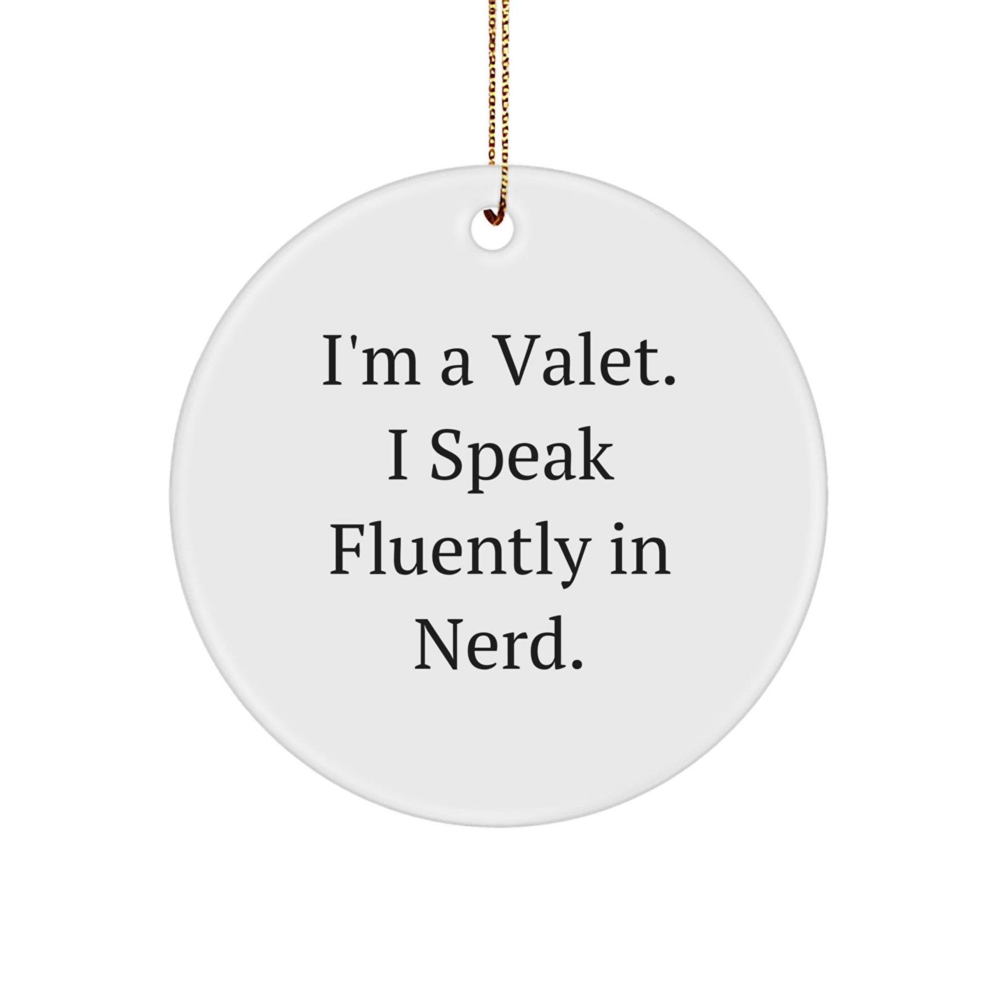 This ornament is a great way to add some humor to your holiday decorations. The quote 'I'm a Valet. I speak fluently in genius.' is the perfect way to show off your Valet's nerdy side. It's a unique and thoughtful gift that will be treasured for years to come.