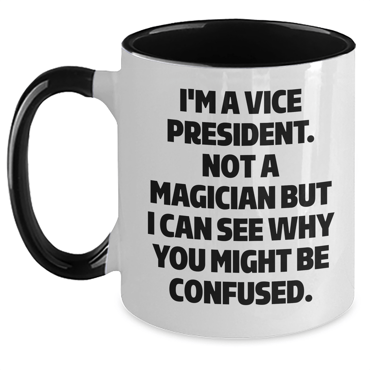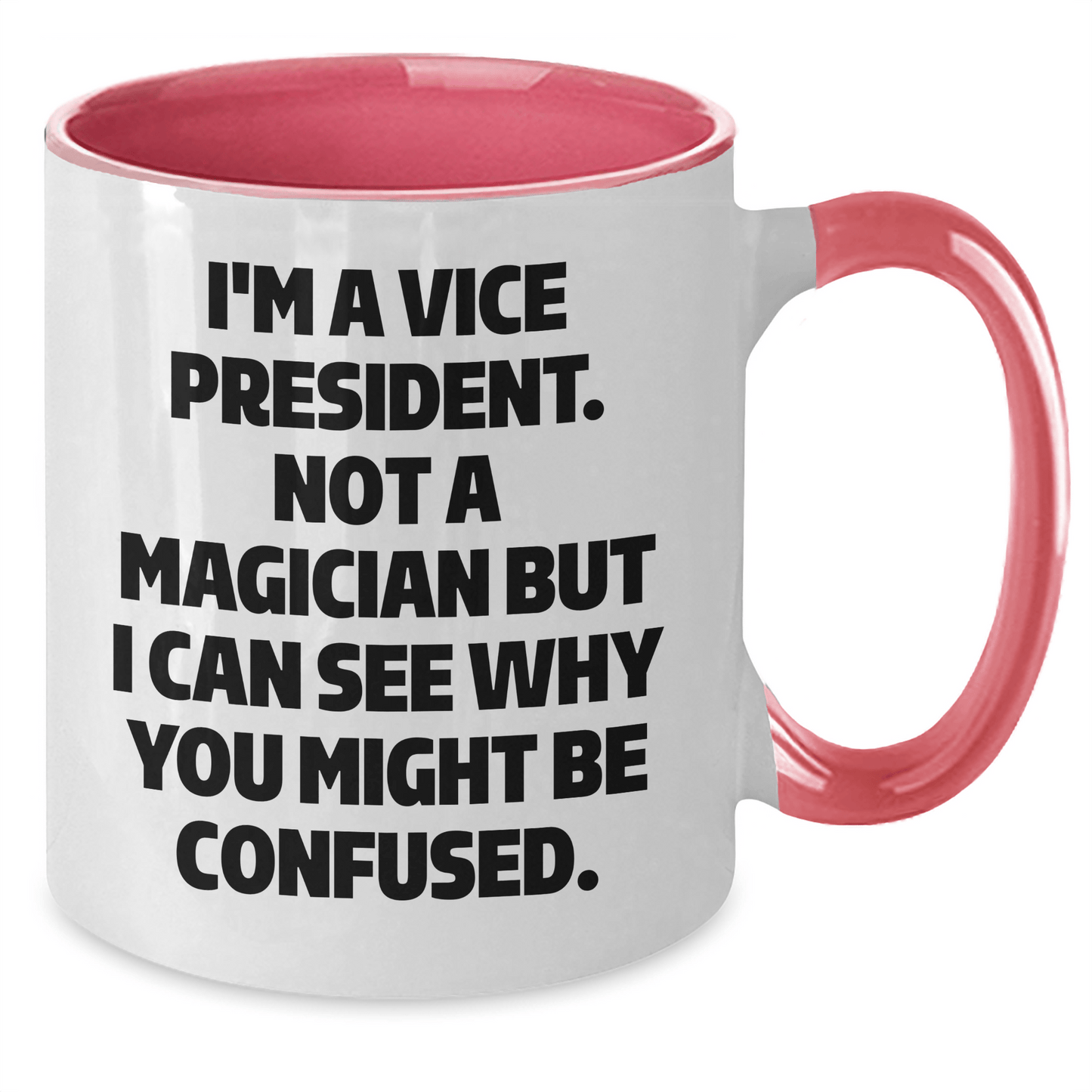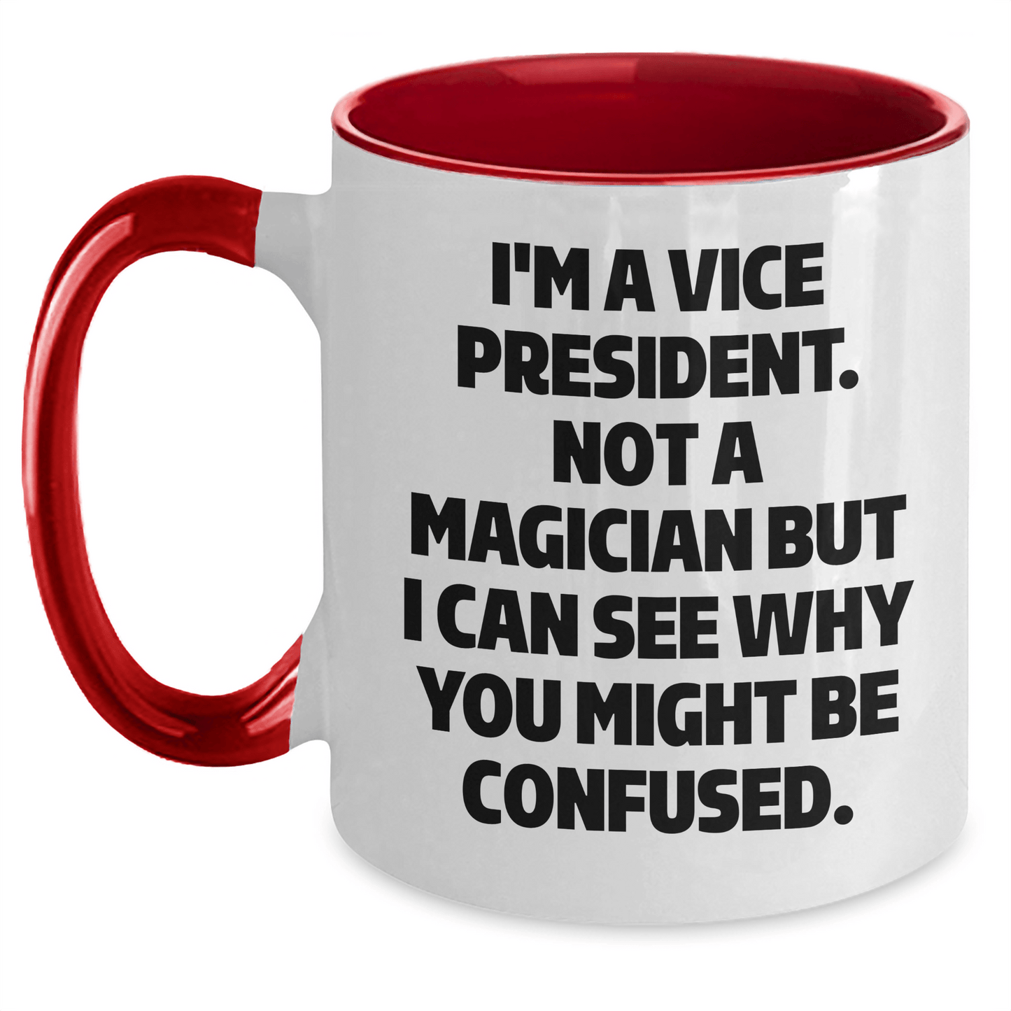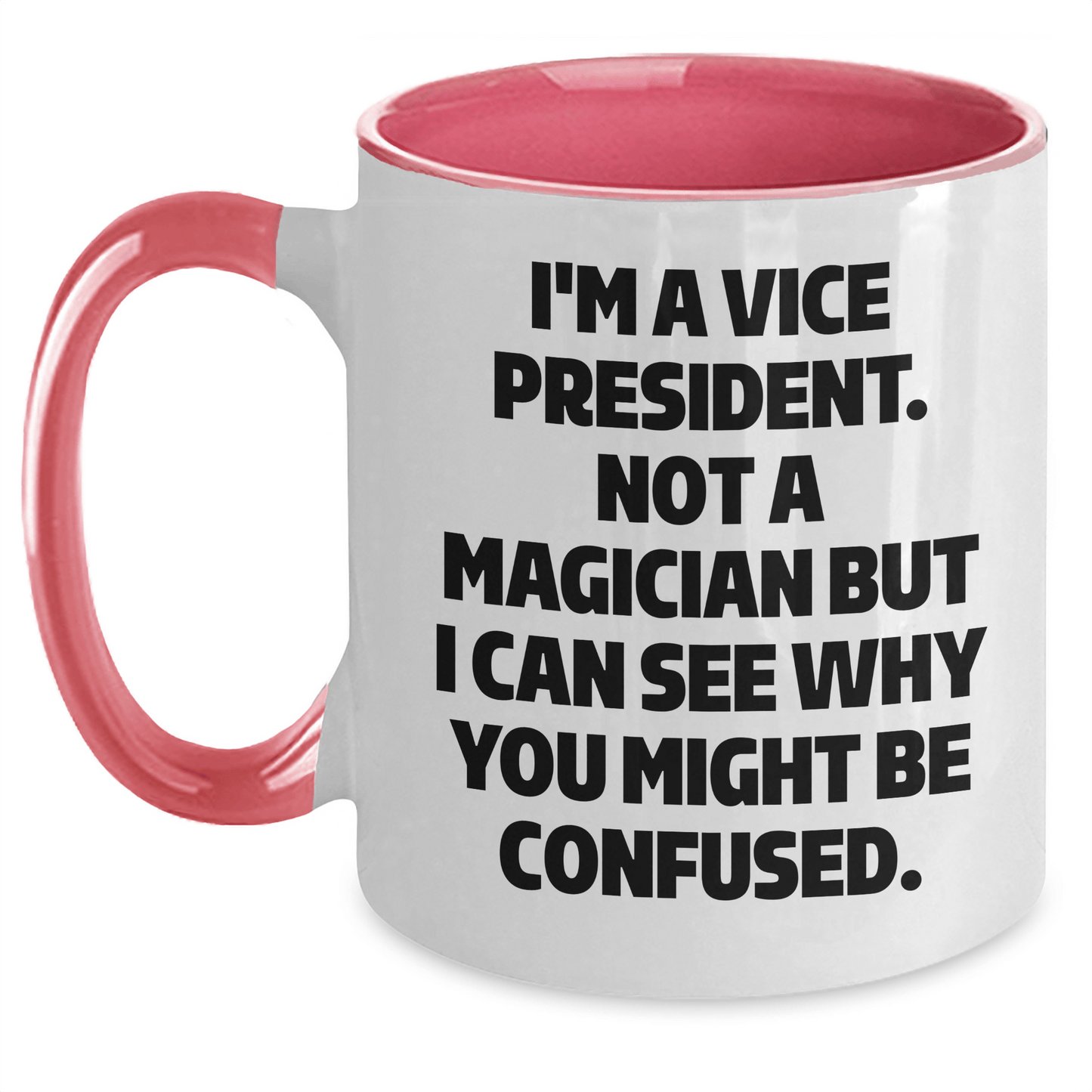 Inspire your favorite Vice President with this unique and funny quote mug. The quote 'I'm A Vice President. Not A Magician But I Can See Why You Might Be Confused.' perfectly captures the humor and humility of a Vice President. This two-tone coffee mug is made from ceramic and is available in four color combinations - Black and White, Red and White, Navy and White, and Pink and White. With an 11oz capacity, it's perfect for their morning coffee or afternoon tea. Whether you're celebrating a graduation or just want to show your appreciation for their hard work, this gift is sure to bring a smile to their face. Gift it to your Vice President friends, colleagues, or family members and watch them enjoy their daily beverages in style. This thoughtful gift is a great way to show your Vice President that you care.