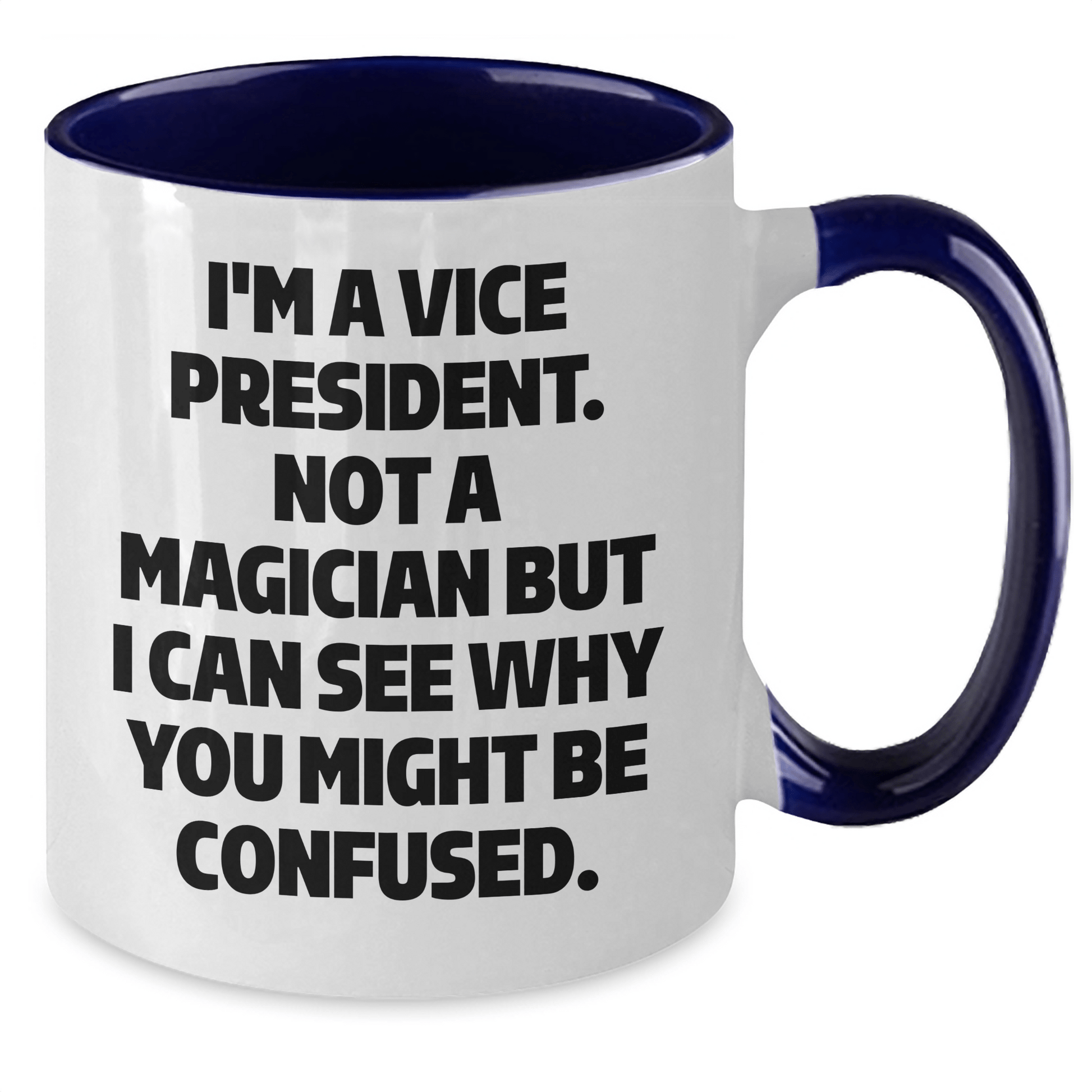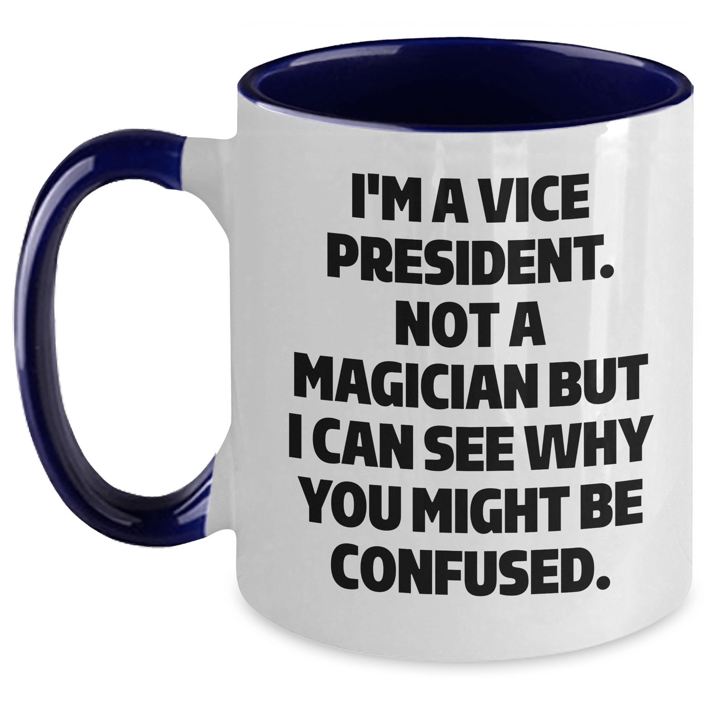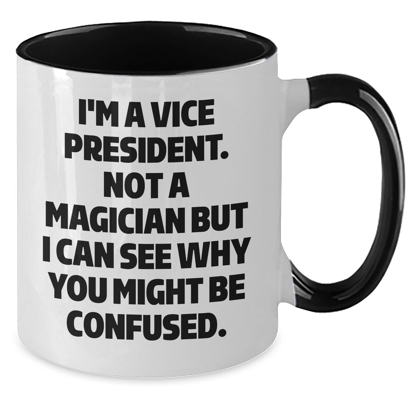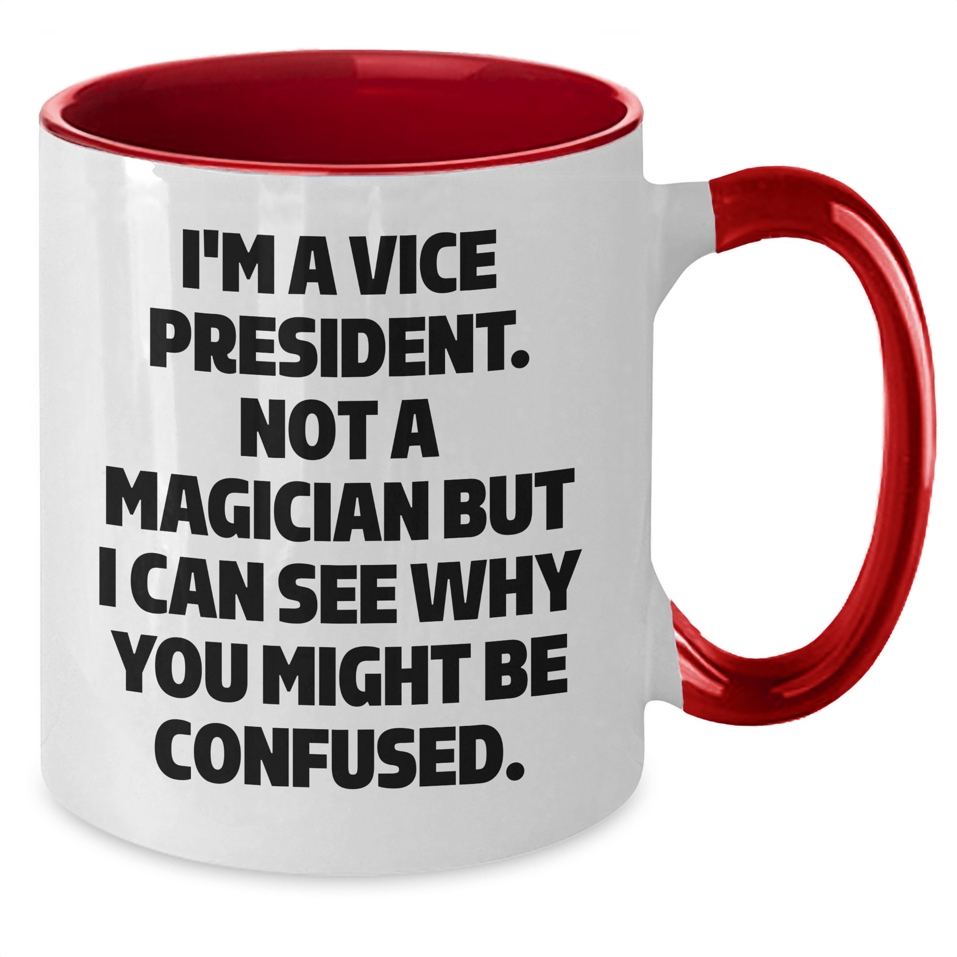 Inspire your favorite Vice President with this unique and funny quote mug. The quote 'I'm A Vice President. Not A Magician But I Can See Why You Might Be Confused.' perfectly captures the humor and humility of a Vice President. This two-tone coffee mug is made from ceramic and is available in four color combinations - Black and White, Red and White, Navy and White, and Pink and White. With an 11oz capacity, it's perfect for their morning coffee or afternoon tea. Whether you're celebrating a graduation or just want to show your appreciation for their hard work, this gift is sure to bring a smile to their face. Gift it to your Vice President friends, colleagues, or family members and watch them enjoy their daily beverages in style. This thoughtful gift is a great way to show your Vice President that you care.