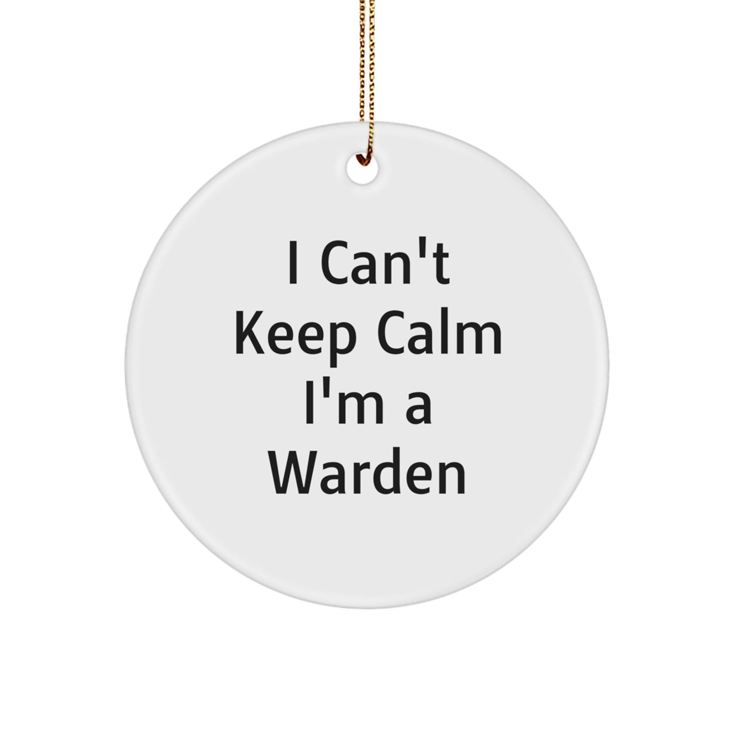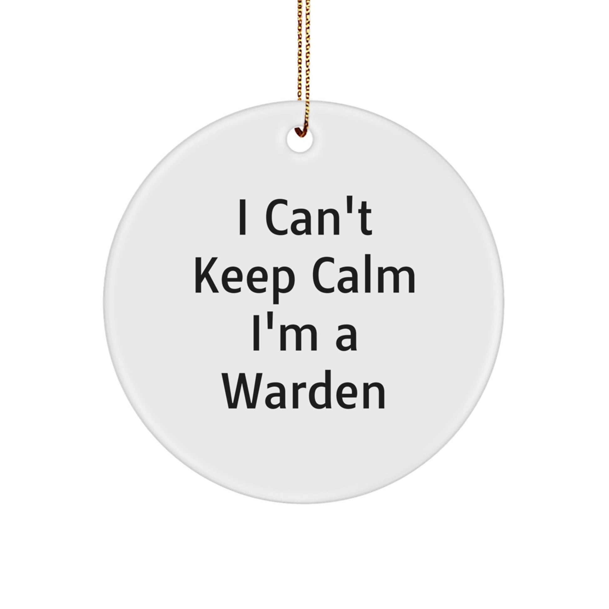 - Show your Warden pride with this funny and relatable Circle Ornament, featuring the quote 'I Can't Keep Calm I'm A Warden'. It's a unique and thoughtful gift for Warden friends, family, or coworkers.