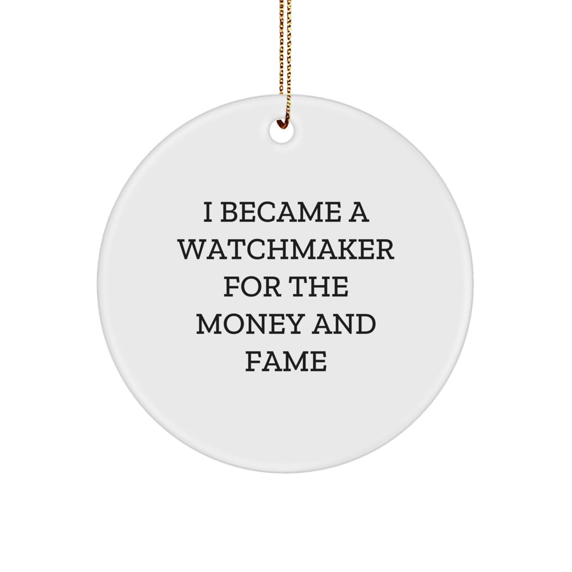 Are you looking for a unique gift for a watchmaker or a watch enthusiast? Look no further! Our Circle Ornament is a thoughtful and humorous gift that will make them smile. With its white color and circle shape, it's a beautiful addition to any room. The quote 'I Became A Watchmaker For The Money And Fame' is a funny and relatable message that will resonate with anyone who loves watches. This ornament is a great way to show your appreciation for a watchmaker or to celebrate their profession. Whether you're buying for a friend, family member, or coworker, this ornament is sure to be a hit. So why wait? Don't miss out and make a statement with this unique and thoughtful gift!