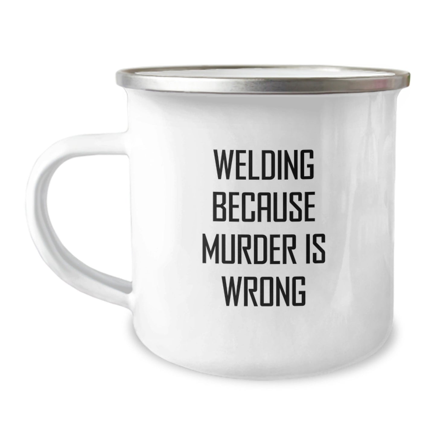 - This Welding Camping Mug is a great way to show your appreciation for the welding community, with its stainless steel with enamel finish and 12 oz capacity. The quote 'Welding Because Murder Is Wrong' is a funny and lighthearted way to poke fun at the seriousness of welding. This mug is perfect for any welding enthusiast or someone who loves a good laugh. Whether you're celebrating a birthday, a milestone, or just because, this mug is the perfect way to show your appreciation.