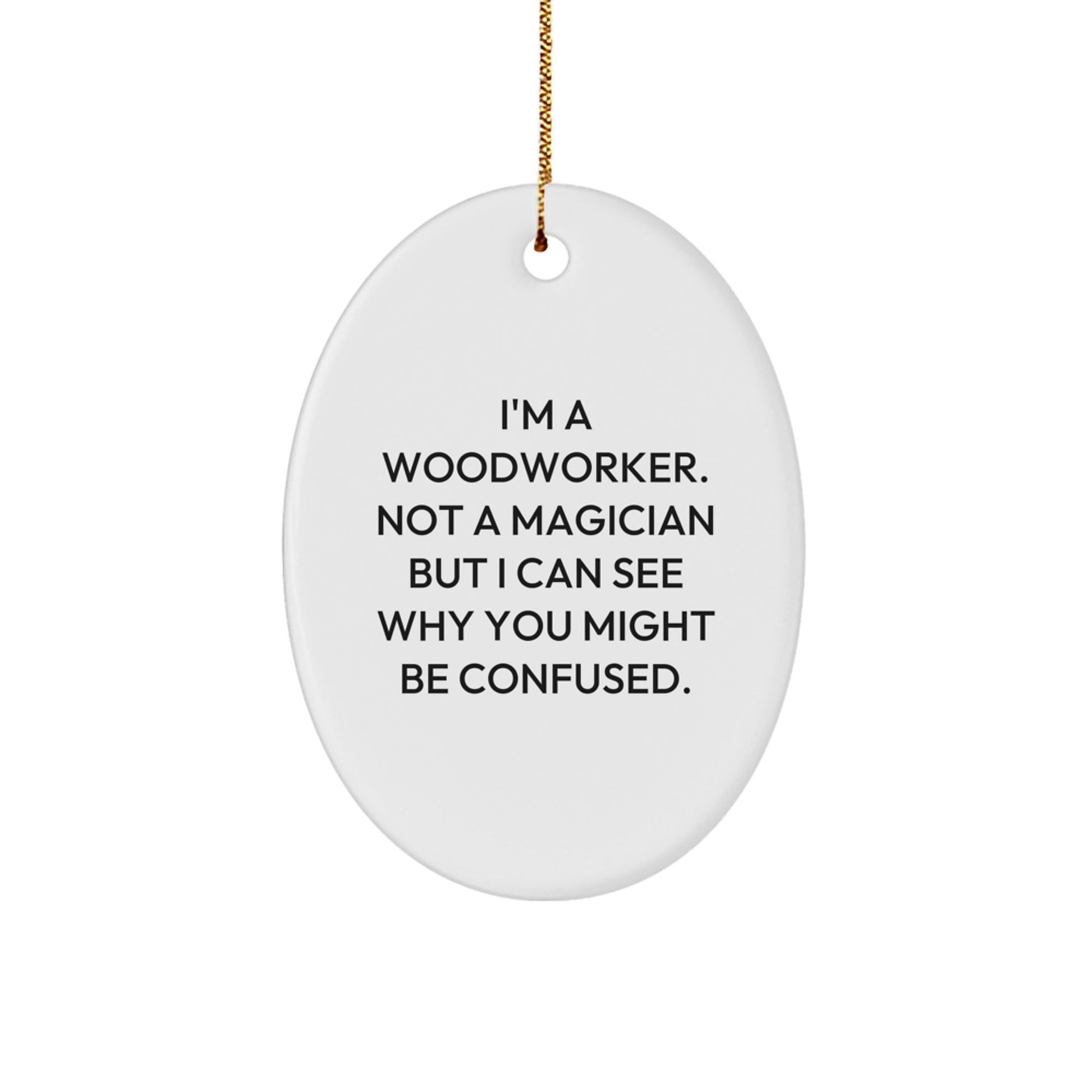 Are you a woodworker or know someone who loves to work with wood? This funny quote oval ornament is the ideal gift for any woodworker's workshop or home decor. Made from sturdy MDF with a high-gloss plastic finish, it's lightweight and resistant to breaking, making it a great choice for households with children or pets. The vibrant quote is printed from edge-to-edge via Sublimation, ensuring bright, vivid colors. Ships with a festive gold cord for easy hanging, perfect for stress-free decorating. Give the gift of a good laugh to any woodworker in your life this Christmas.